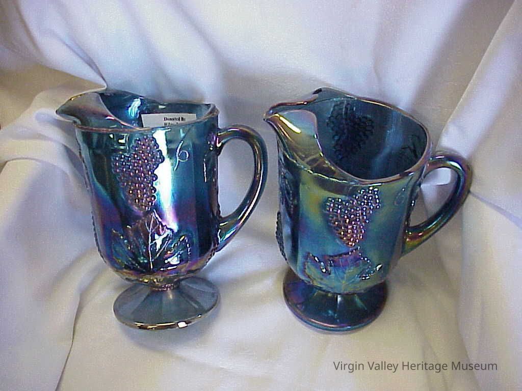A carnival glass water pitcher decorated with the Indiana "Harvest Pattern". Carnival glass was most popular in the 1920s as a faux imitation of more expensive glass brands such as Tiffany or Loetz.
