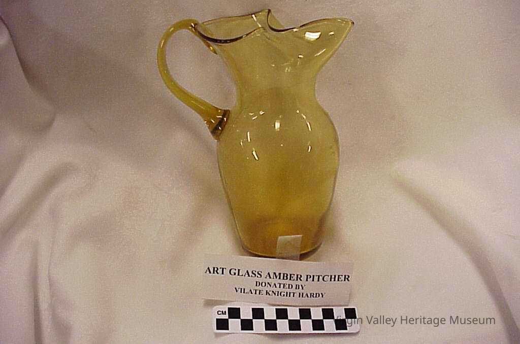 An art glass amber pitcher donated to the museum by Velate Hardy.