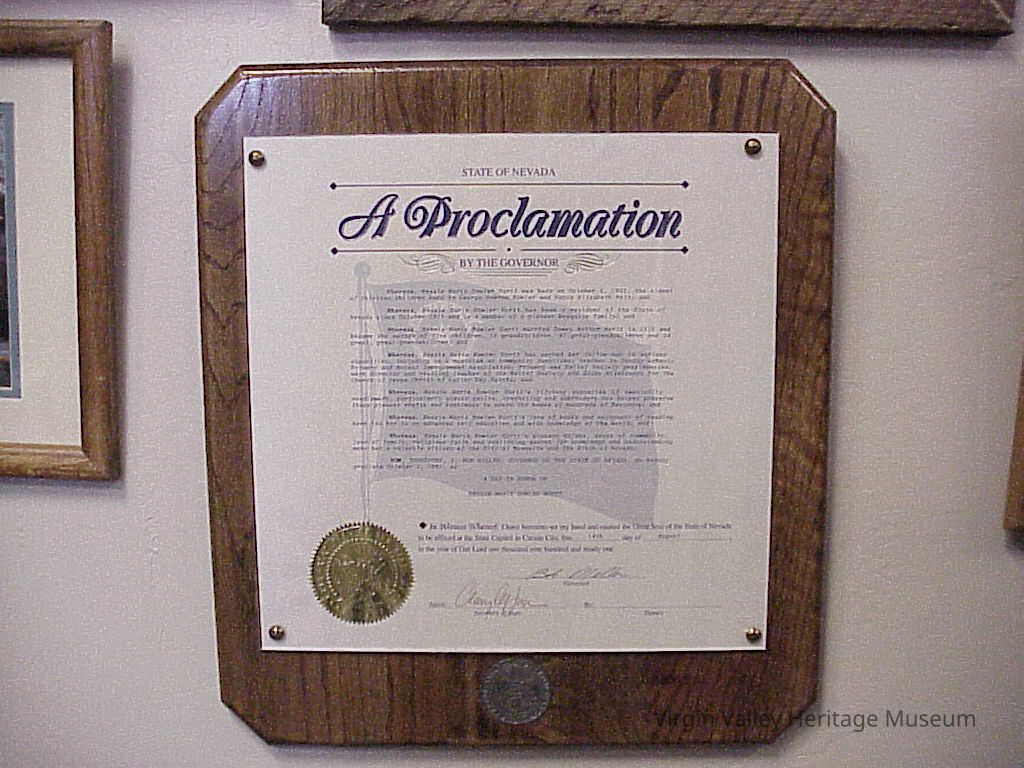 Proclamation for day of honor for Bessie Marie Bowler Hortt, by Nevada Governor Bob Miller on her 90th birthday, October 1, 1991