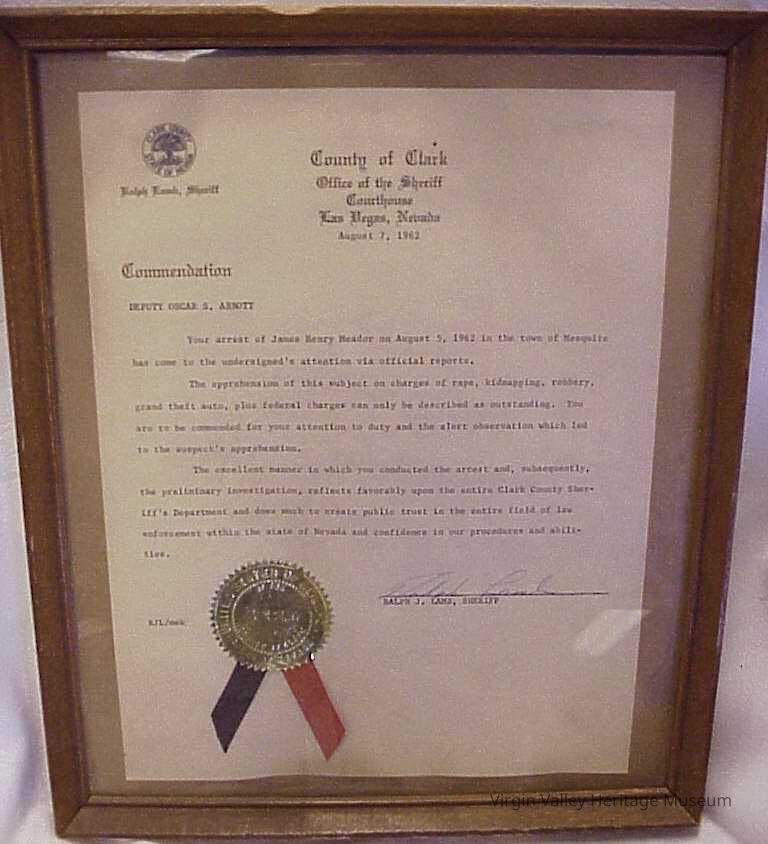 Commendation Plaque presented to Oscar S. Abbott from Ralph J. Lamb, Sheriff , for the arrest of James Henry Meador.