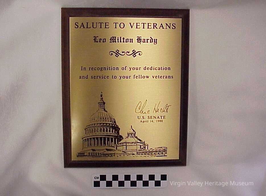 Plaque to Leo Milton Hardy In recognition to service to fellow veterans from the U.S. Senate Chic Hecht April 16, 1988