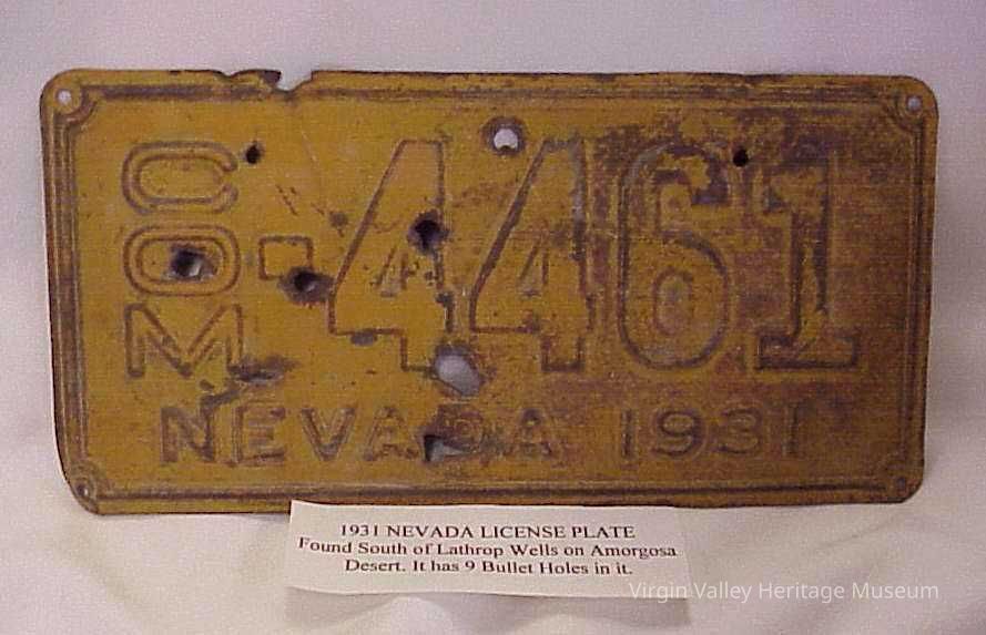Nevada license plate 1931. Found south of Lathrop Wells on Arimagosa Desert. It has 9 Bullet Holes in it.