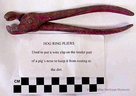 Hog ring pliers Used to put a wire clip on the tender part of a pig's nose to keep it from rooting in the dirt.