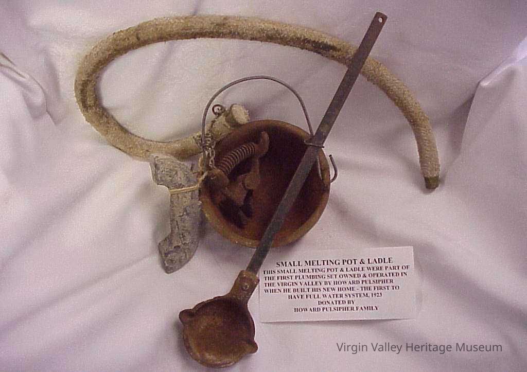This small melting pot & ladle were part of the first plumbing set owned & operated in the Virgin Valley by Howard Pulsipher when he built his new home. The first to have full water system in 1923.