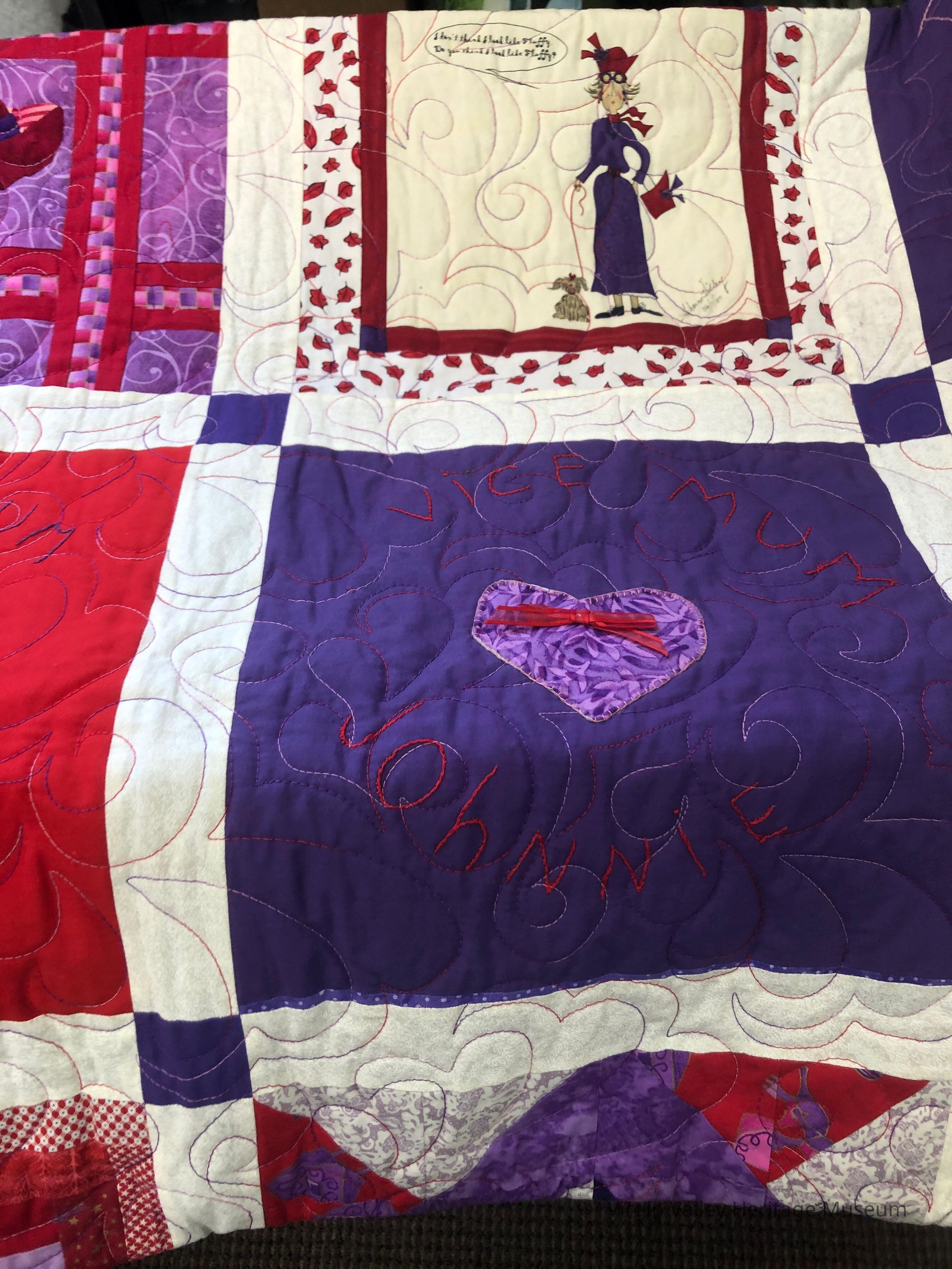 A red hat quilt donated to the museum by Sandy Sorenson.