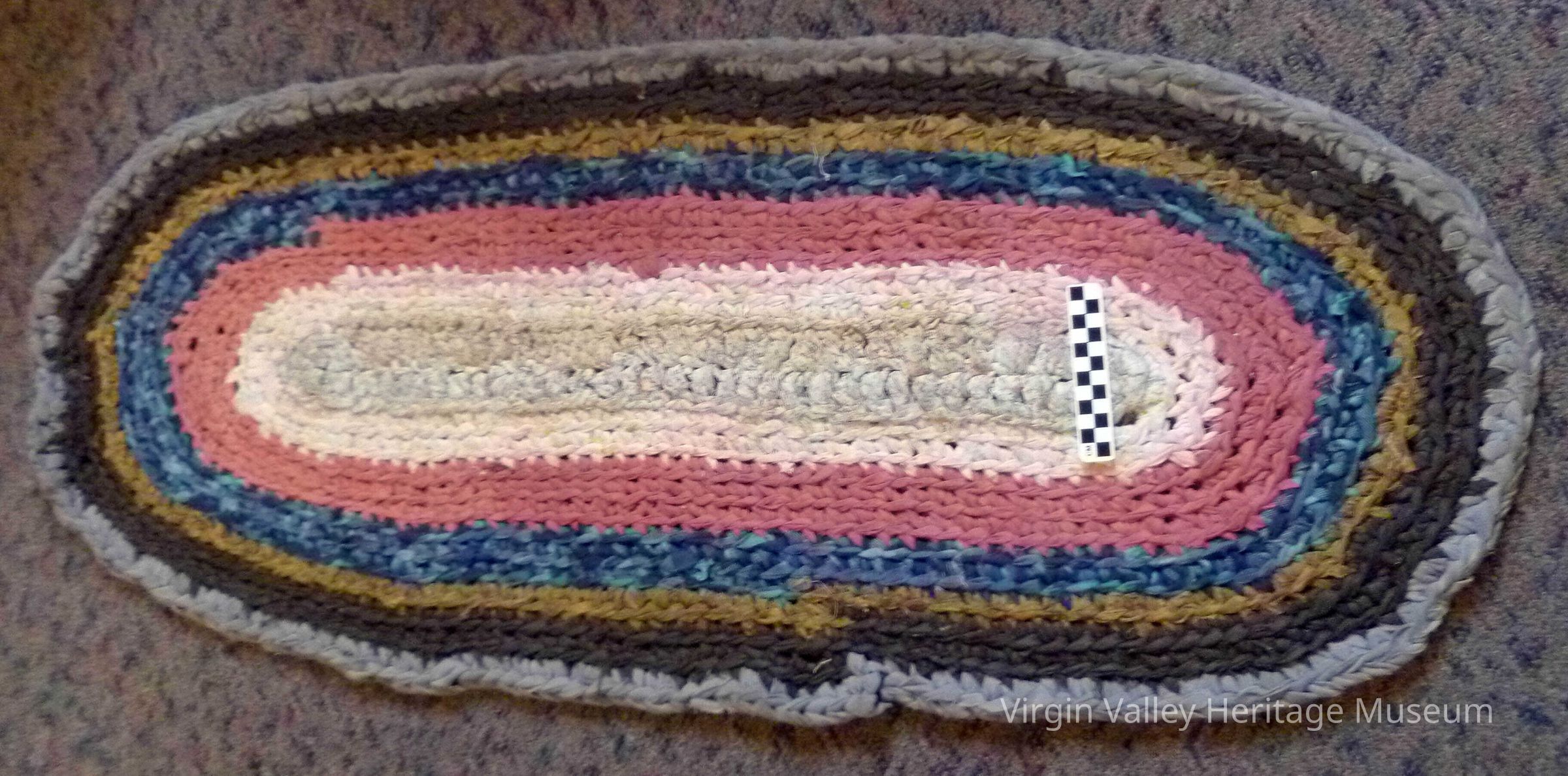 An oval rag rug. Rag rugs use a variety of different materials and fabrics. They were most popular during the Great Depression and the Industrial Revolution due to their thrifty nature.