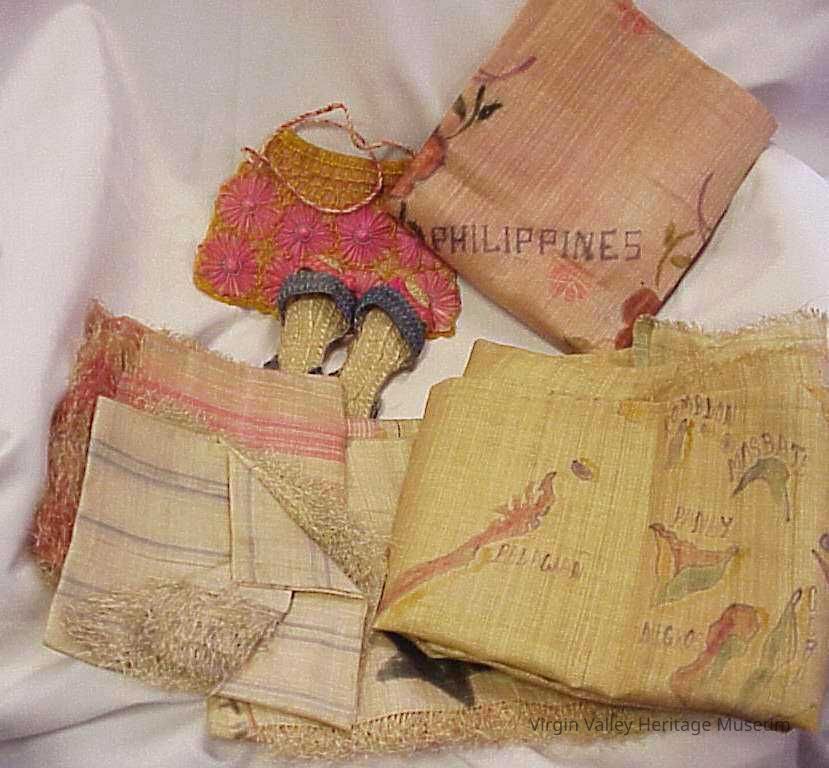Skirt, Sandals, Purse, Map, and Wall Hangings. Brought back home from the Philippines during World War II, by Stewart Pulsipher Material and maps in Display Q