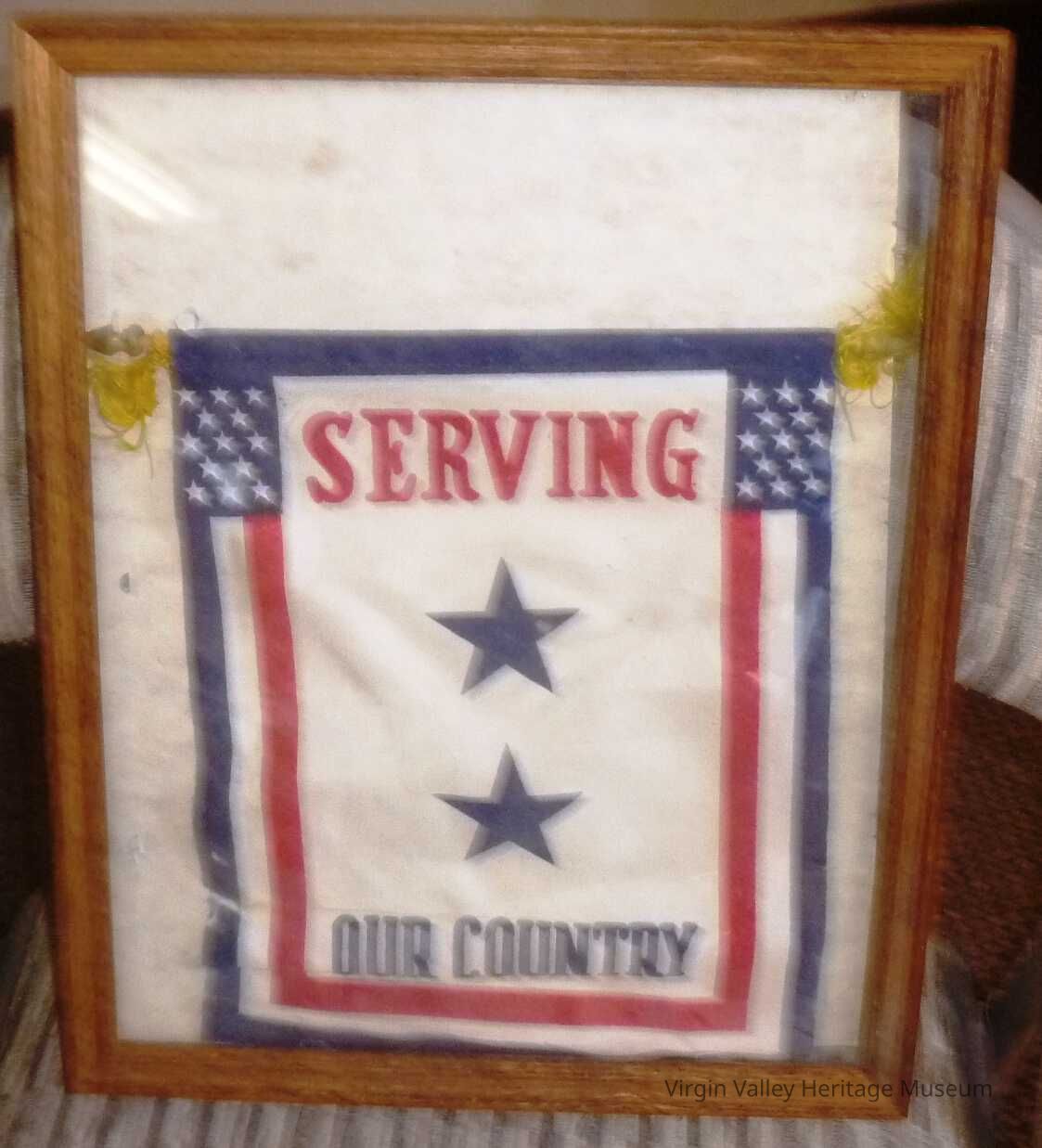 Service flag that would fly in the window of the families that had members in the service during WWII. The stars were either blue for serving, red for wounded, gold for killed in action, one star for each member serving.