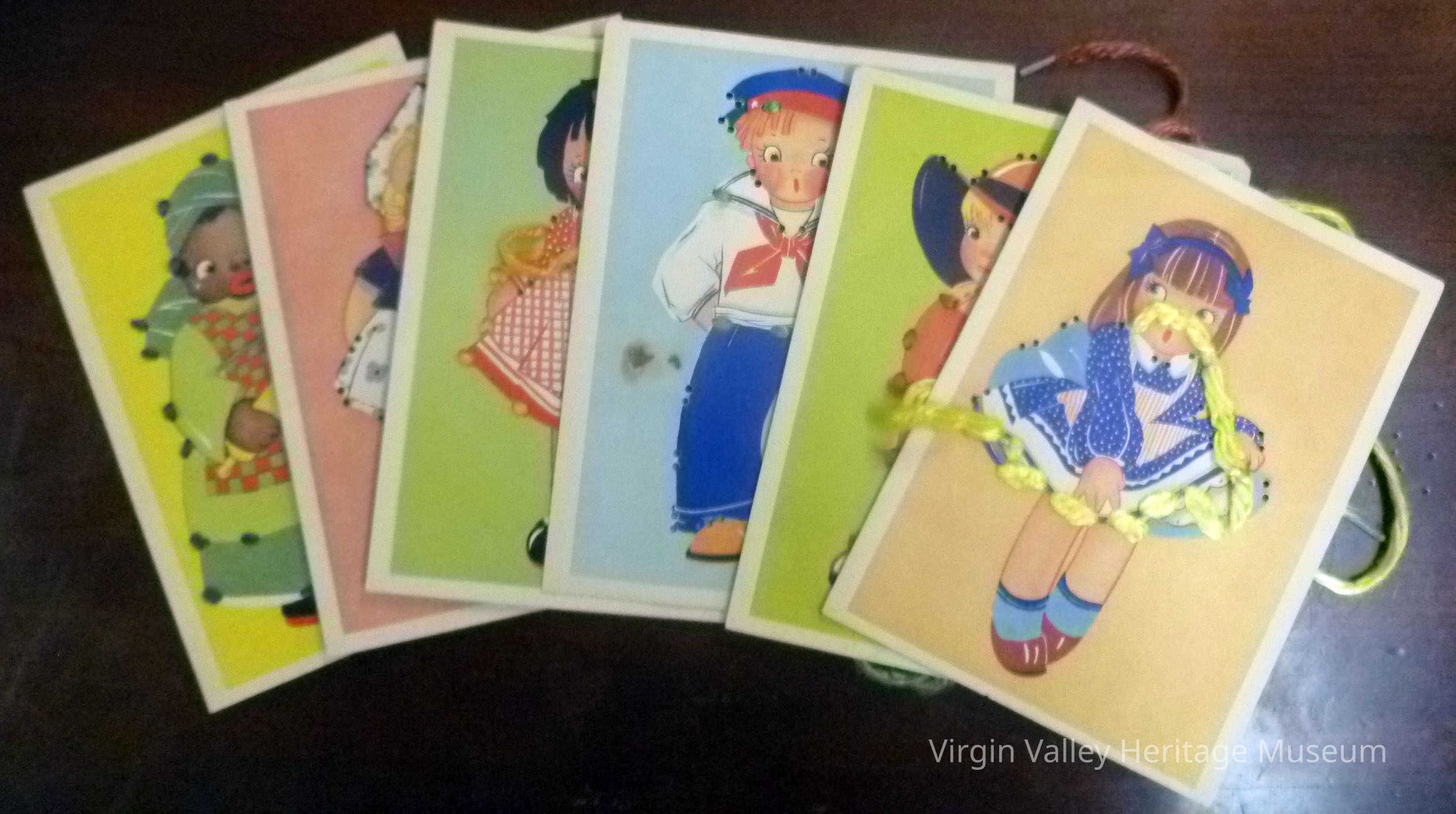 A set of Jolly Dolly sewing cards from the 1940s.