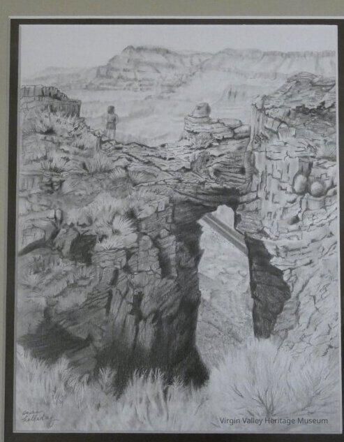 Pencil drawing of mile marker 23 (Shiwit Arch) in the I 15 Virgin valley Gorge. Drawn from behind the arch looking down to the freeway.The drawing is framed and matted measuring 171/2" x 14 1/2 " complete.