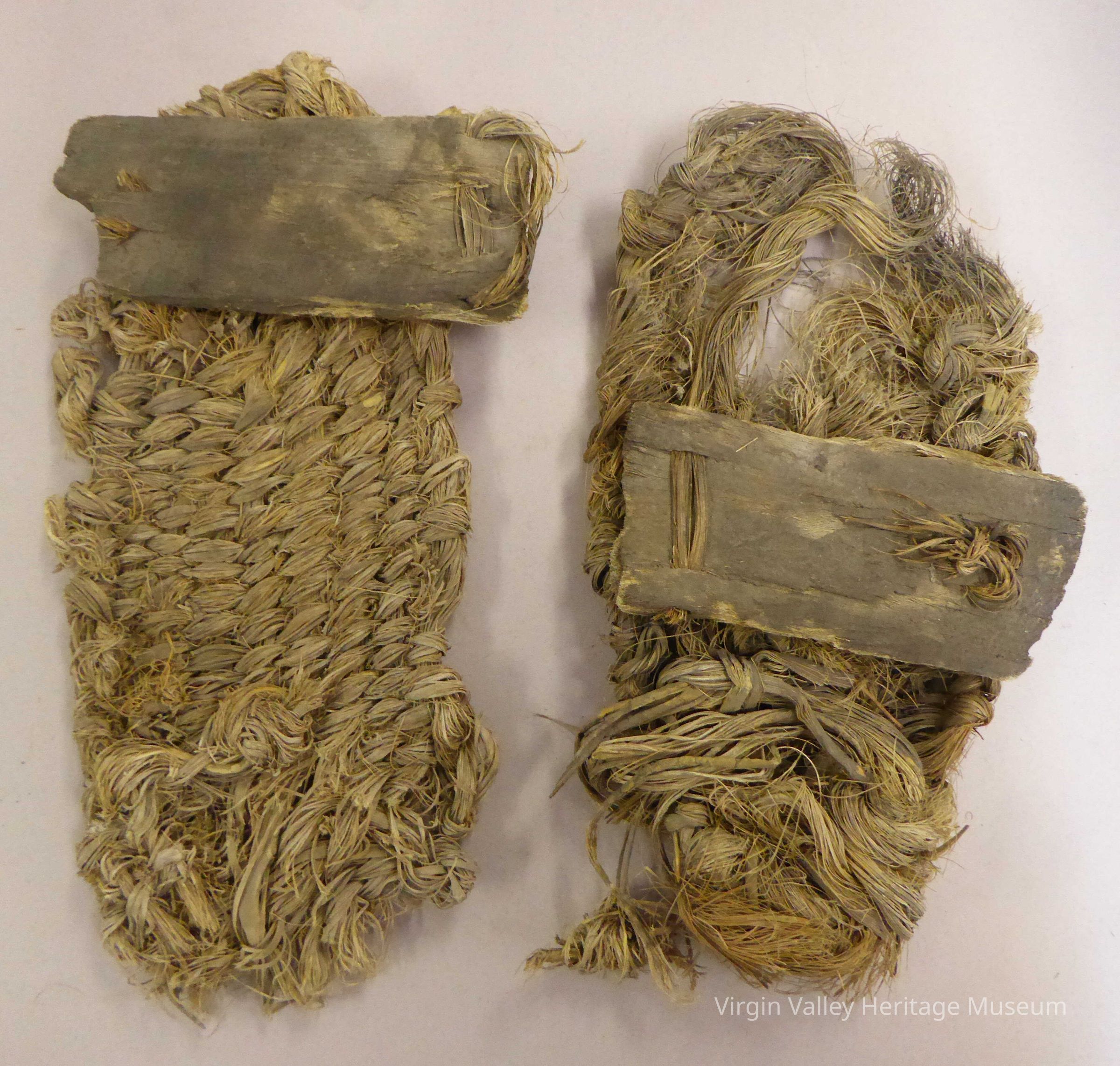 An assortment of balls of fiber, pottery shards, rocks, and Native American footwear. They were found in a cave up in the Mormon Mountains circa 1960. The sandals are woven out of yucca fiber and date to somewhere around 1200 - 1400 AD. Many Native American sandals from around this time frame have been found scattered throughout caves in the west, but no one knows why Native Americans deposited their sandals in caves.