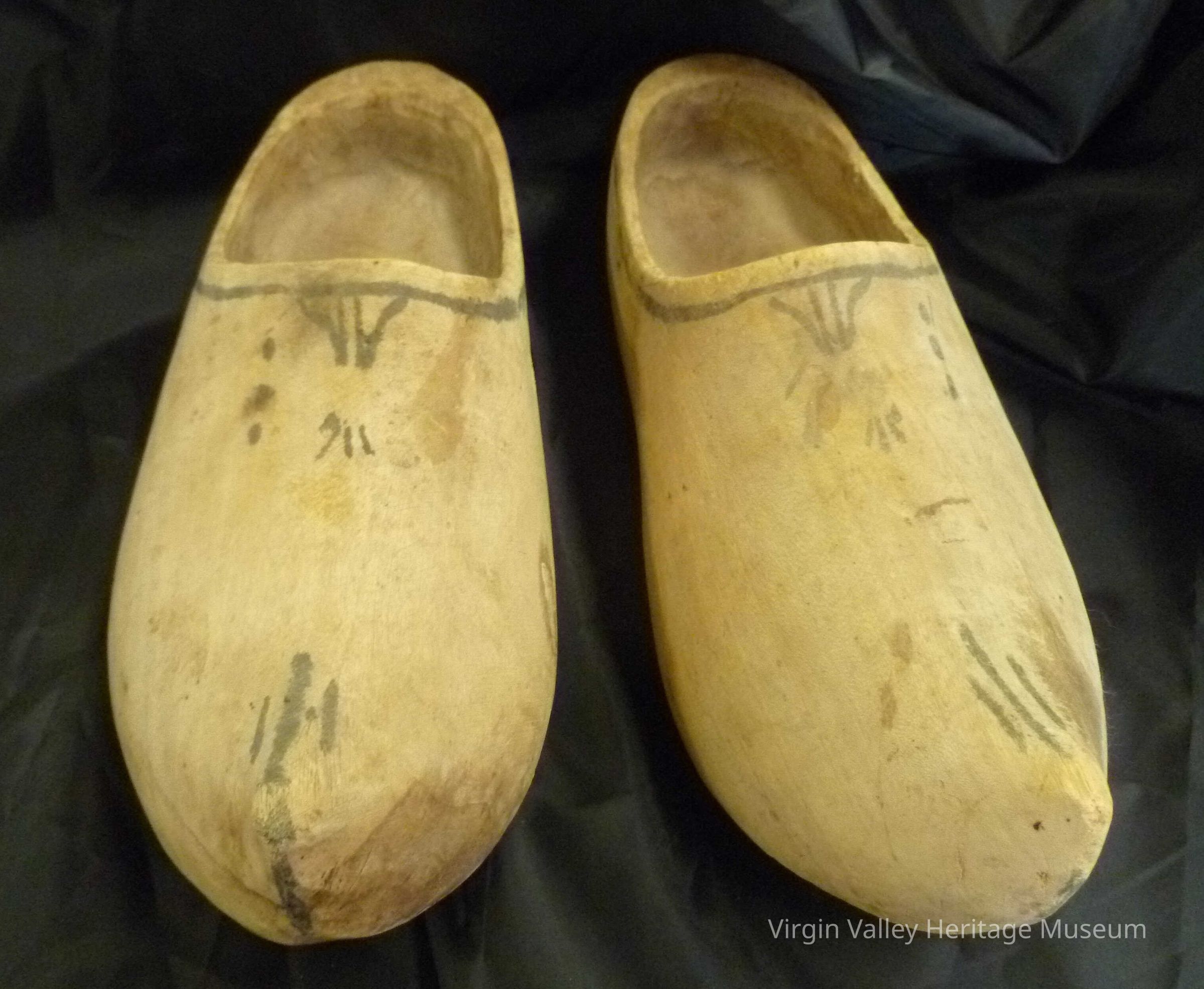 A pair of wooden clogs brought back from Germany circa 1940 by Max Hafen. Max Hafen served an LDS mission in Germany, which is where his grandparents, John George and Susetta Bosshard Hafen were originally from. His son, Max "Tim" Hafen, was one of the original settlers of the Pahrump Valley.