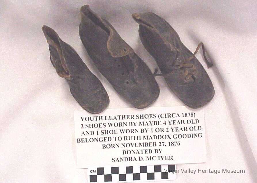 Youth Leather shoes (circa 1878) 2 shoes worn by maybe a 4 year old and 1 shoe worn by a 1 or 2 year old. Belonged to Ruth Maddox Gooding born November 27, 1876