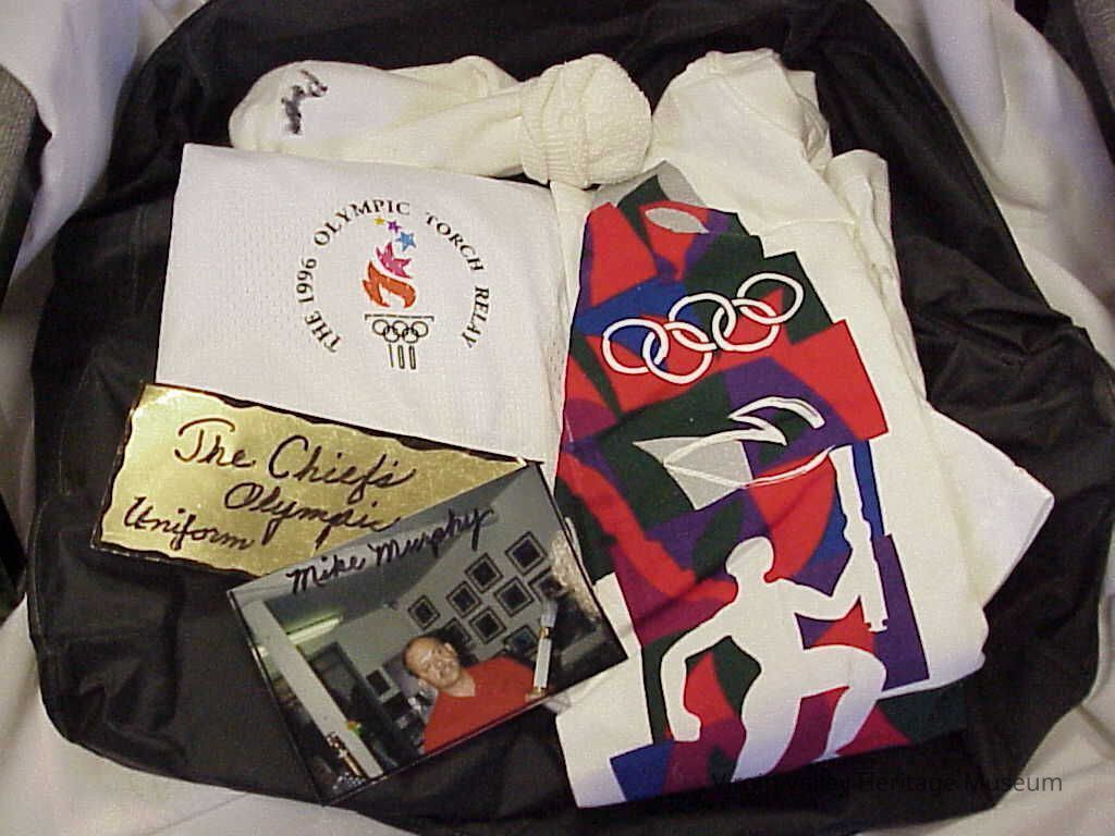 Uniform worn by Chief of Police, Mike Murphy while carrying the Olympic torch in 1996. Shirt, Shorts, and Socks