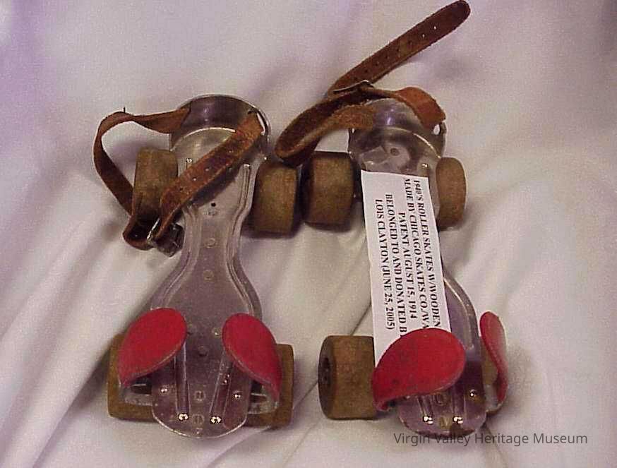 Roller skates with wooden wheels from the 1940s. They belonged to Lois Clayton, wife of Peter Clayton, who was an volunteer and employee of the museum for fifteen years.