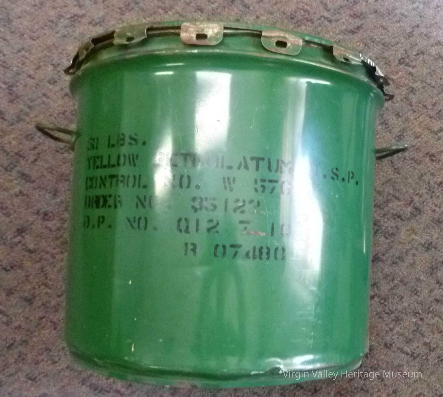 Pail, green in color with the following markings