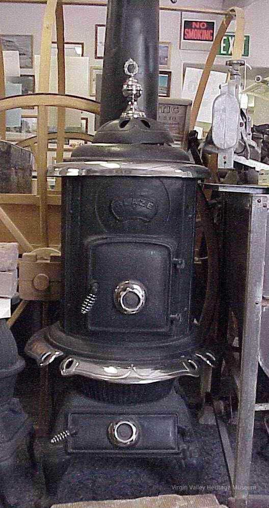 A blaze stove that would have been used to burn wood or coal for heat. This stove belonged to the old Relief Society House, which was built in 1935. In 1948, an official chapel was built in town, and the Relief Society House was converted into a regular home that was occupied by Verde and Wesley Hughes.