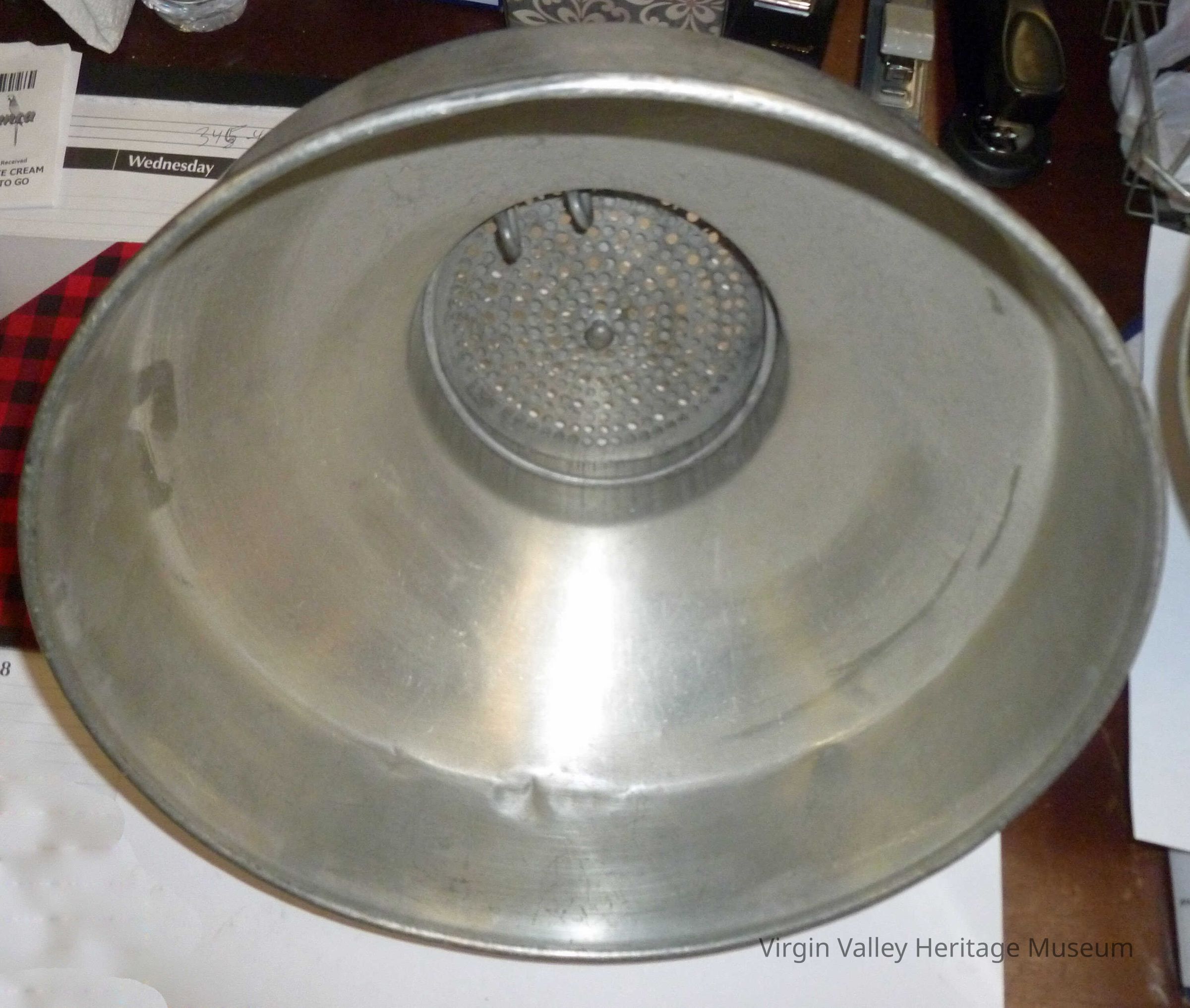 Large and small metal milk strainer. Two different size inserts.Donated by Nora and Esmond Hughes family