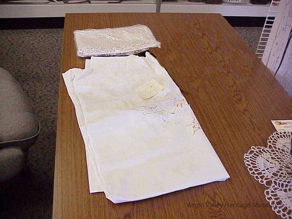 Two tablecloths made by Lena Bowler Hughes and donated to the museum by her granddaughter Imogene Carter (Ken Carter). Lena handwork was impeccable. Here we have and example of her embroidery work and crocheting.This is typical of the women of the Valley to take something very plain and personalize it with handwork very time consuming and at the same time satisfying.