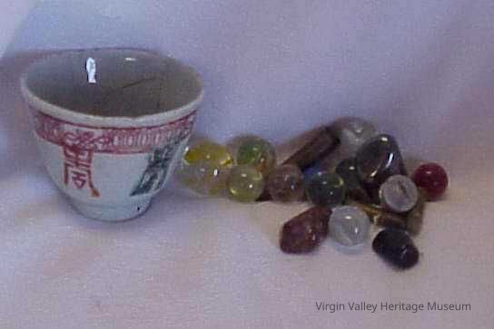 China Tea Cup filled with Marbles, Cartridge and a Polished Hematite