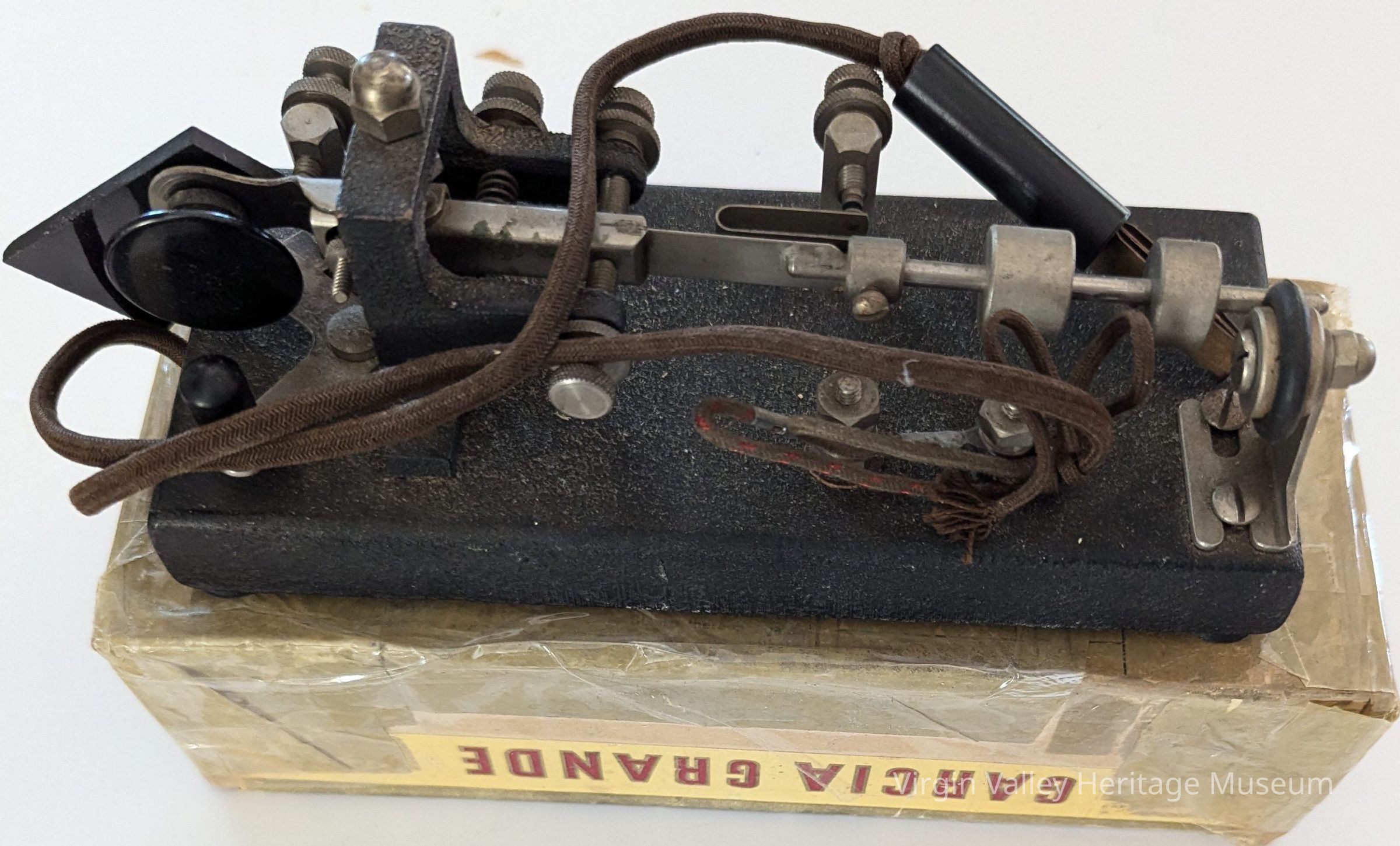 The image shows an old, mechanical telegraph machine resting on a labeled box.