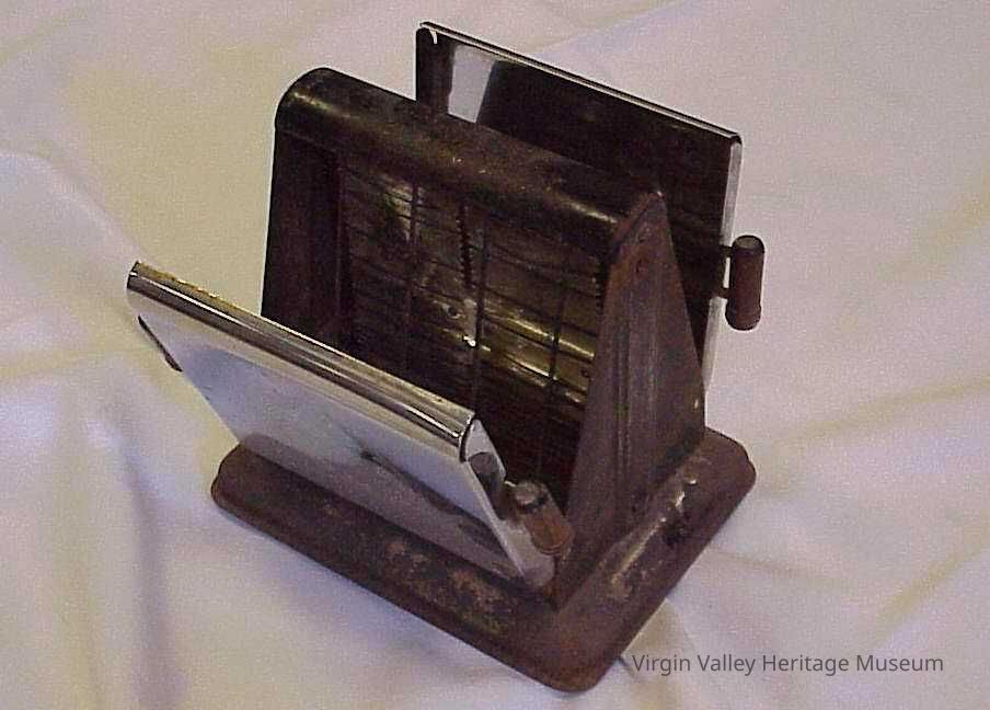 Manufactured by Dominion Electrical MFG.Inc. of Mansfield, Ohio, this is style #1101, 110-120 volts, 450 watts. All metal with 4 wooden feet and 4 wooden handles, the etched sides drop down to allow bread to be placed inside for toasting. The separate cord is missing.