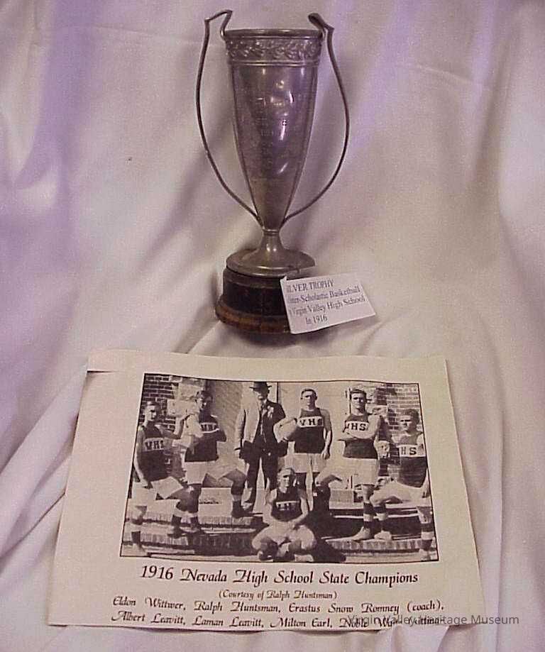 A picture of the Virgin Valley high school basketball team that won the state championship in 1916. The trophy is for wining the state championship. The high school paid $450 for the basketball team to travel and compete in the championships. All of the boys on the team were born and raised in Mesquite and Bunkerville, and they all recount being quite shocked when they visited Reno for the first time.