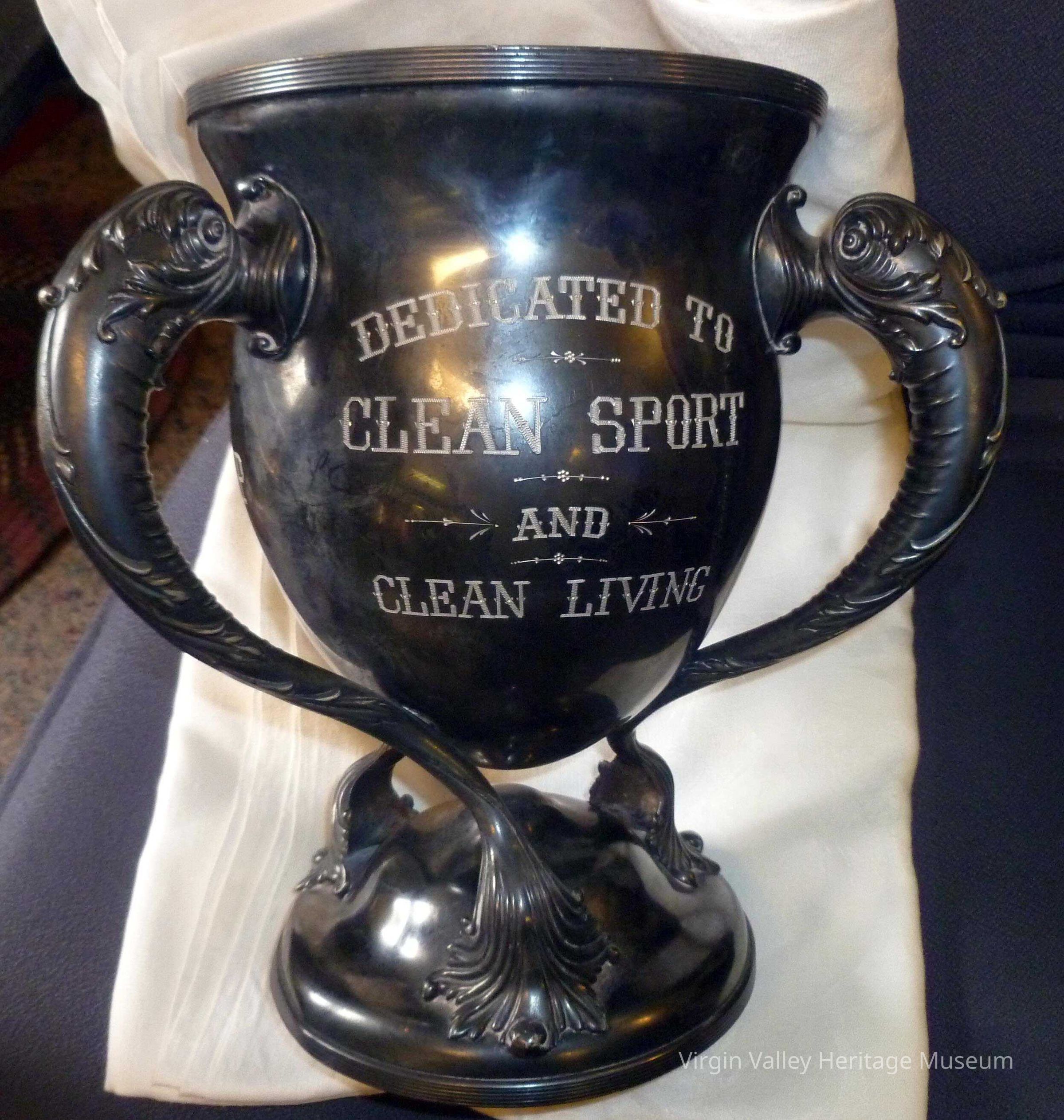 "Emblematic of the Basket-Ball Championship of Clark County" Trophy was won three years in a row also inscribed on trophy "to be held each year by the winner of the annual county series and to become the permanent trophy of the team which shall so win it thrice " Champions 1913 - 1914 - 1915 "Dedicated to Clean sport and Clean Living"