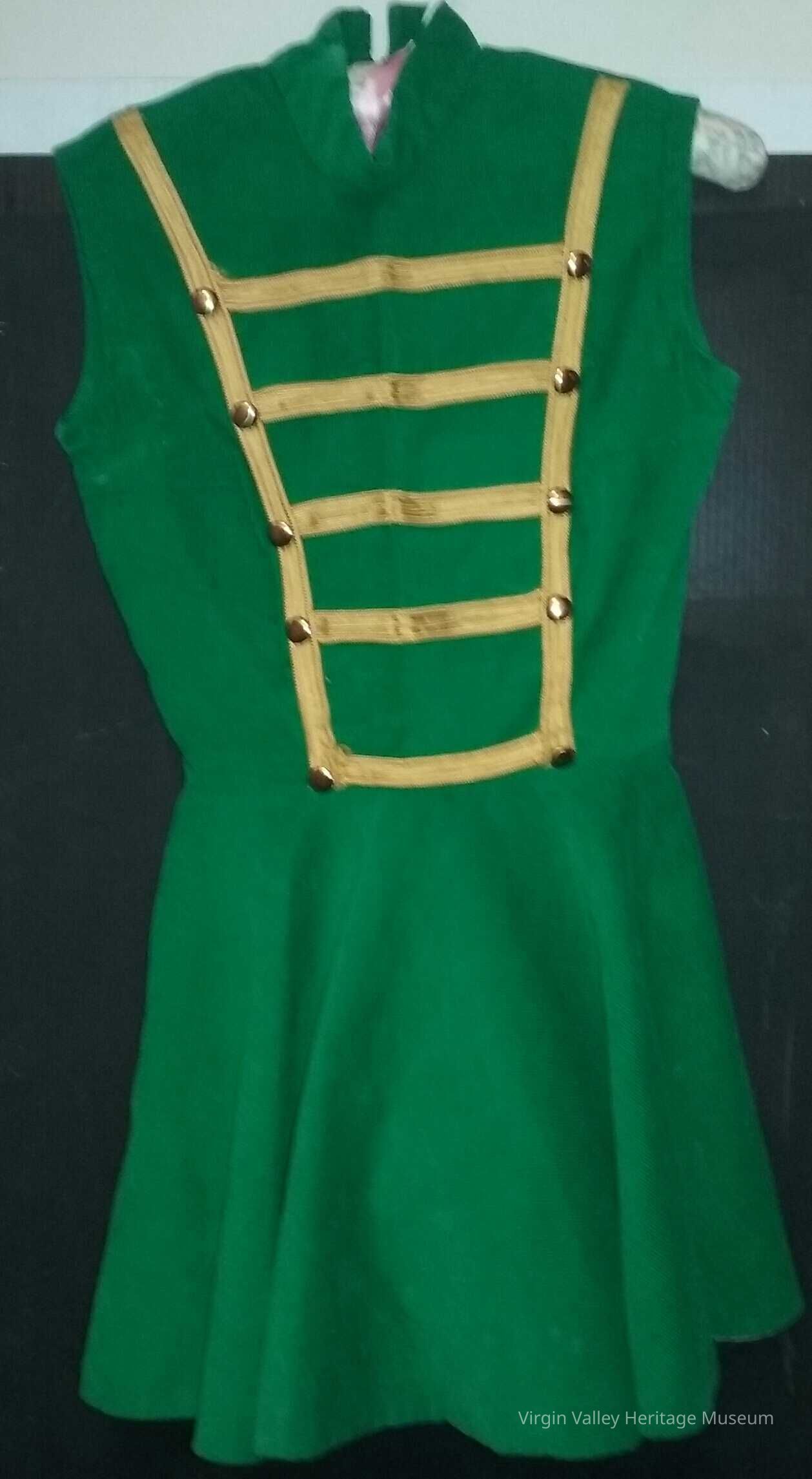 Majorette uniforms and boots belonging to Monta Hafen when she was in drill team at Virgin Valley high School 1952-54 Includes a copy of a photo of Monta Woods Hafen in her uniform.