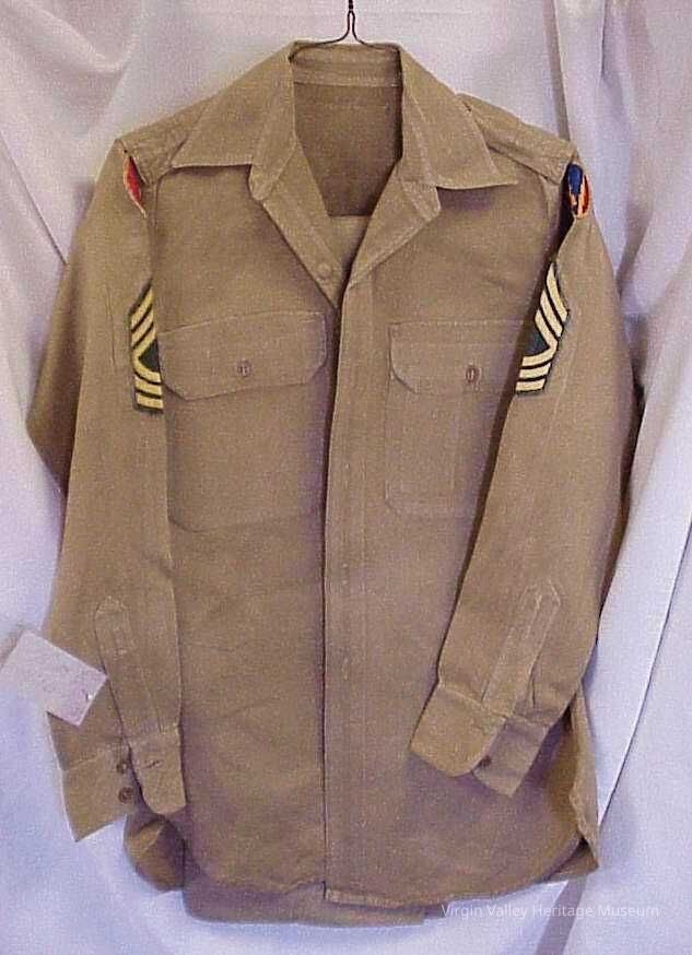 Army fatigue uniform, worn by Wesley Gibson. Shirt and Pants. Style from WW II to Vietnam