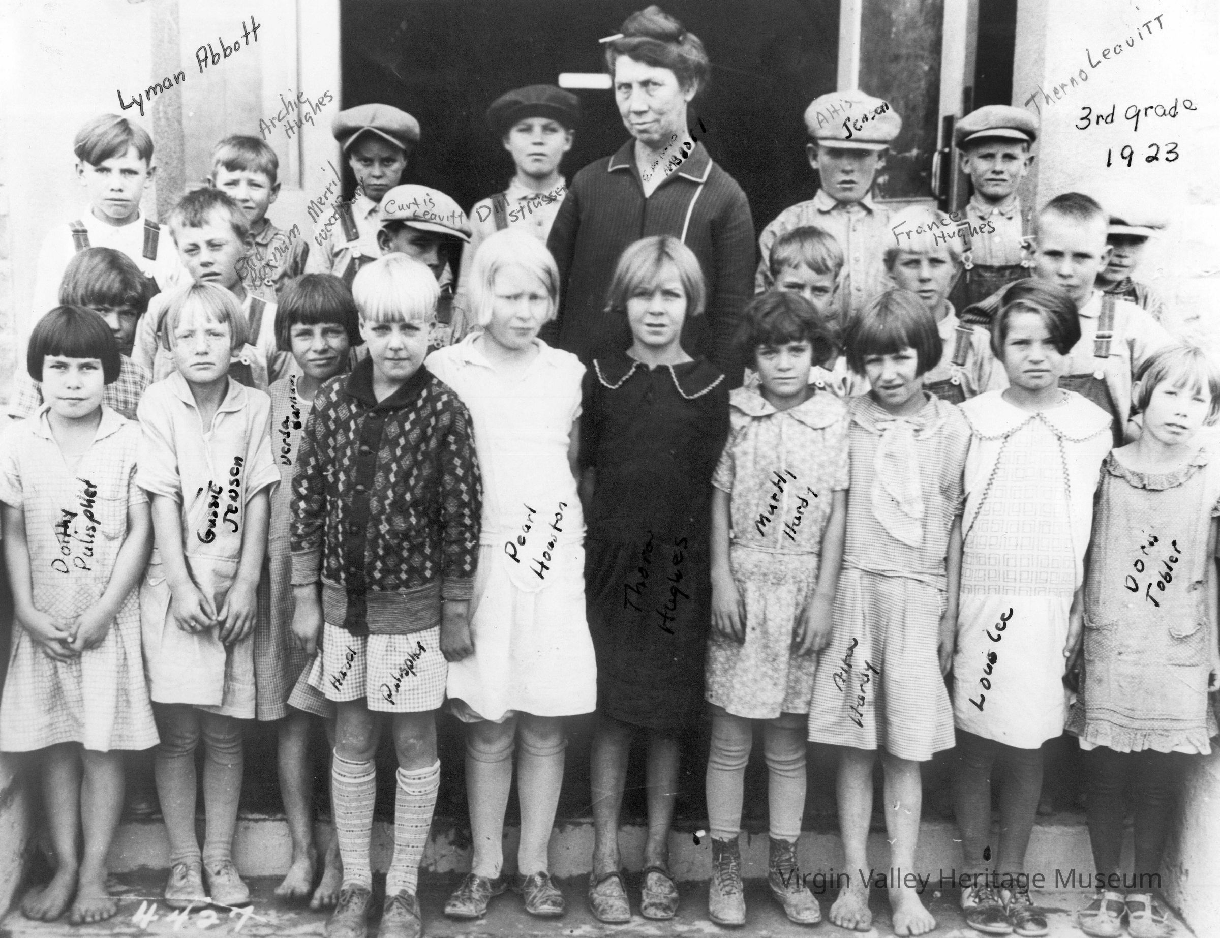 Picture of Upper Elementary Grades 1930 : Dorothy Pulsipher, Gussie Jensen, Verda Barnum, Hazel Pulsipher, Pearl Houston, Thora Hughes, Ora May Hardy, Alta Hardy, Lois Lee, Doris Tobler, LaVere Barnum, Verdon "Bud" Barnum, Curtis Leavitt, Cleo Frehner, Francis Hughes, Emmet Barnum, Merlin Leavitt, Lyman Abbott, Archie Hughes, Murl Woodbury, Dil Strasser, Emma Abbott, Altis Jensen, Theron Leavitt