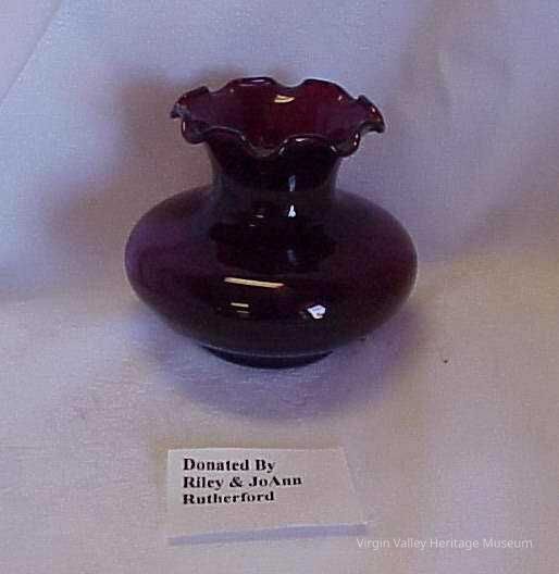 A ruby glass vase donated by Rile and JoAnn Rutherford.