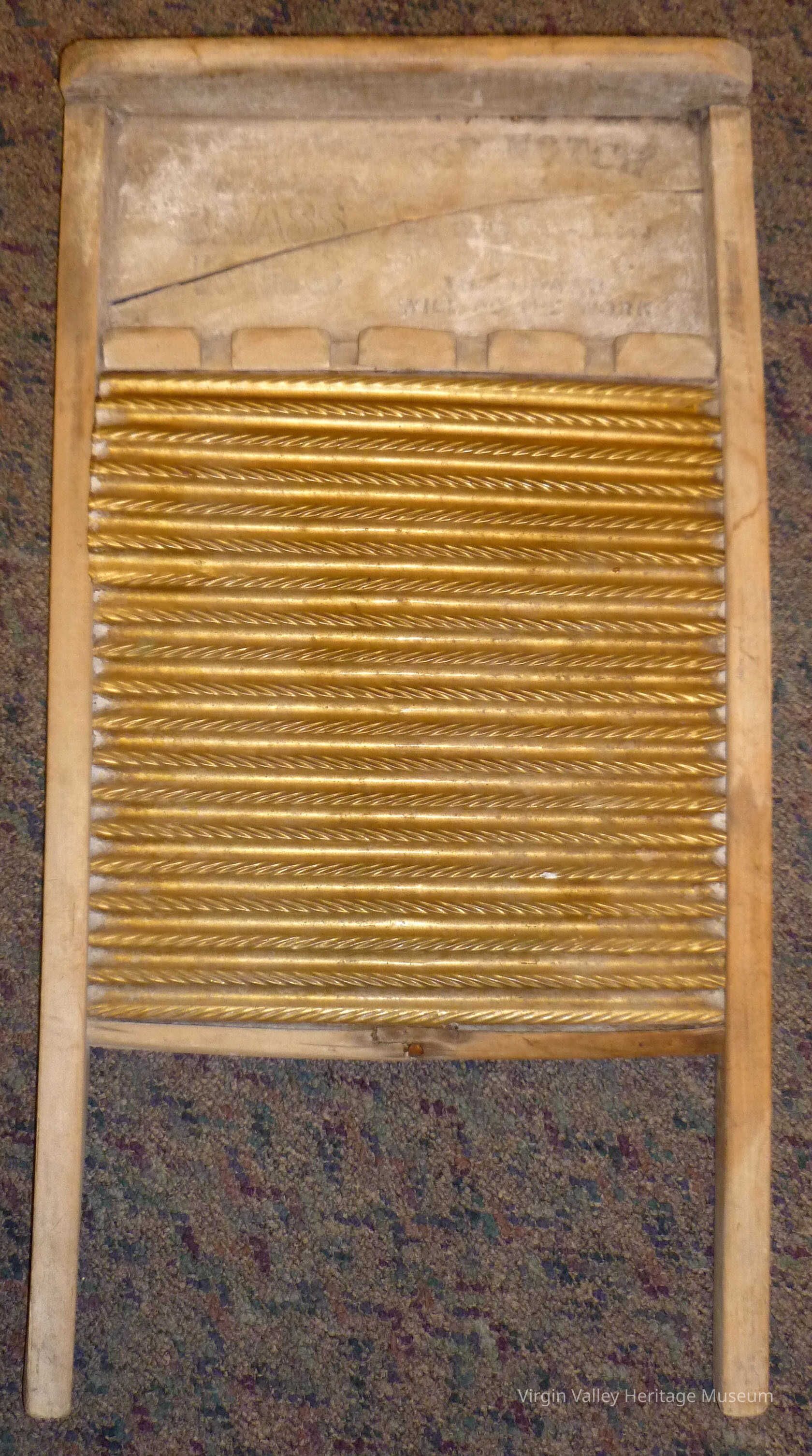 Vintage "National Washboard Co. No. 801" washboard. The washboard is trademarked by US pat. office and made in USA- Chicago-Saginaw-Memphis. The washboard measures 24" long and has a wood frame and brass plate washing surface. The back of the washboard states "The Brass King" and reads "Top Notch, Sanitary Front Drain, The Board will do the work".