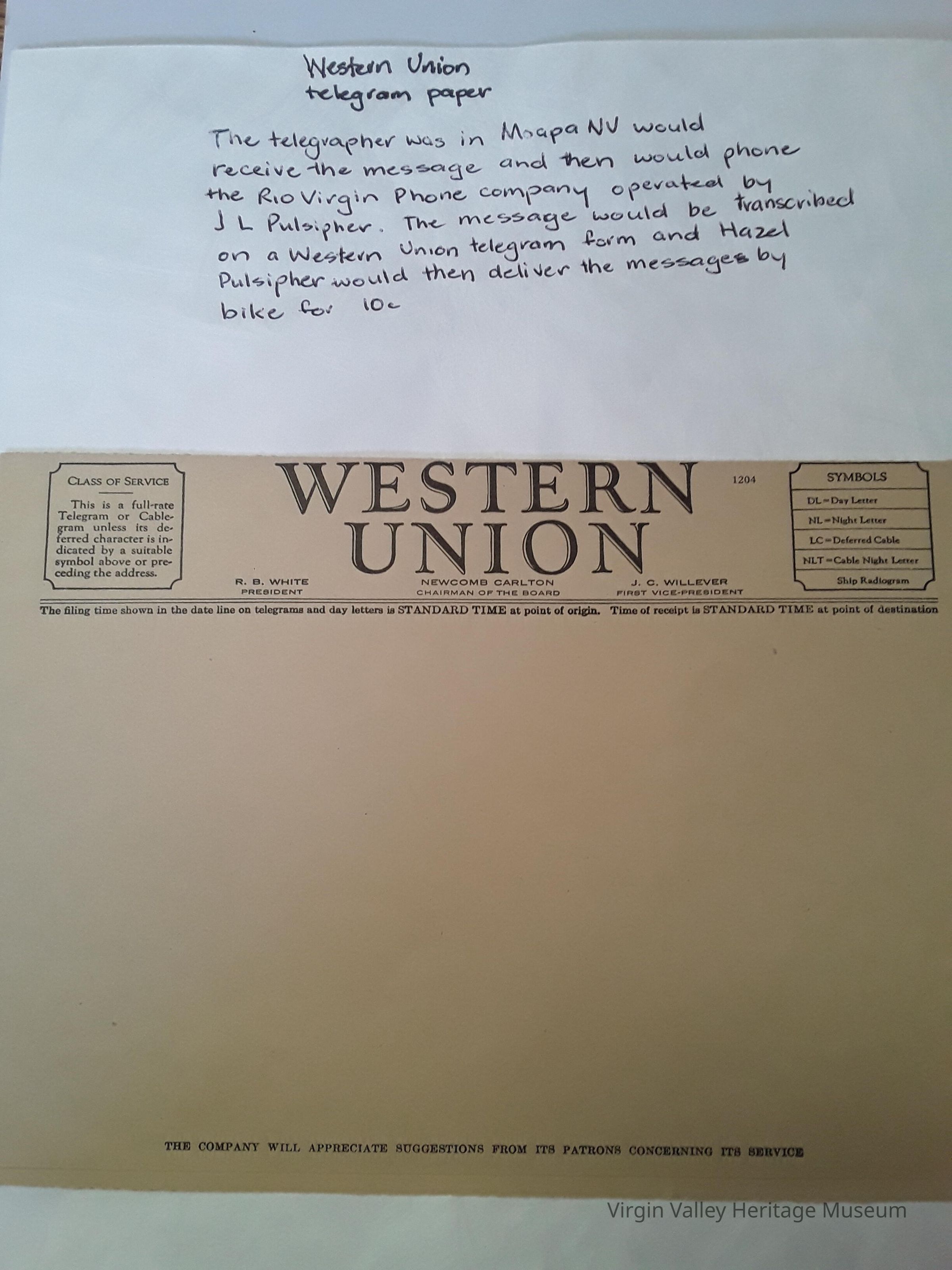 the telegrapher was in Moapa NV would receive the message and then would phone the Rio Virgin Phone Company operated by JL Pulsipher. The message would be transcribe on a Western Union Telegram Form and Hazel Pulsipher would then deliver the messages by bike for .10 cents
