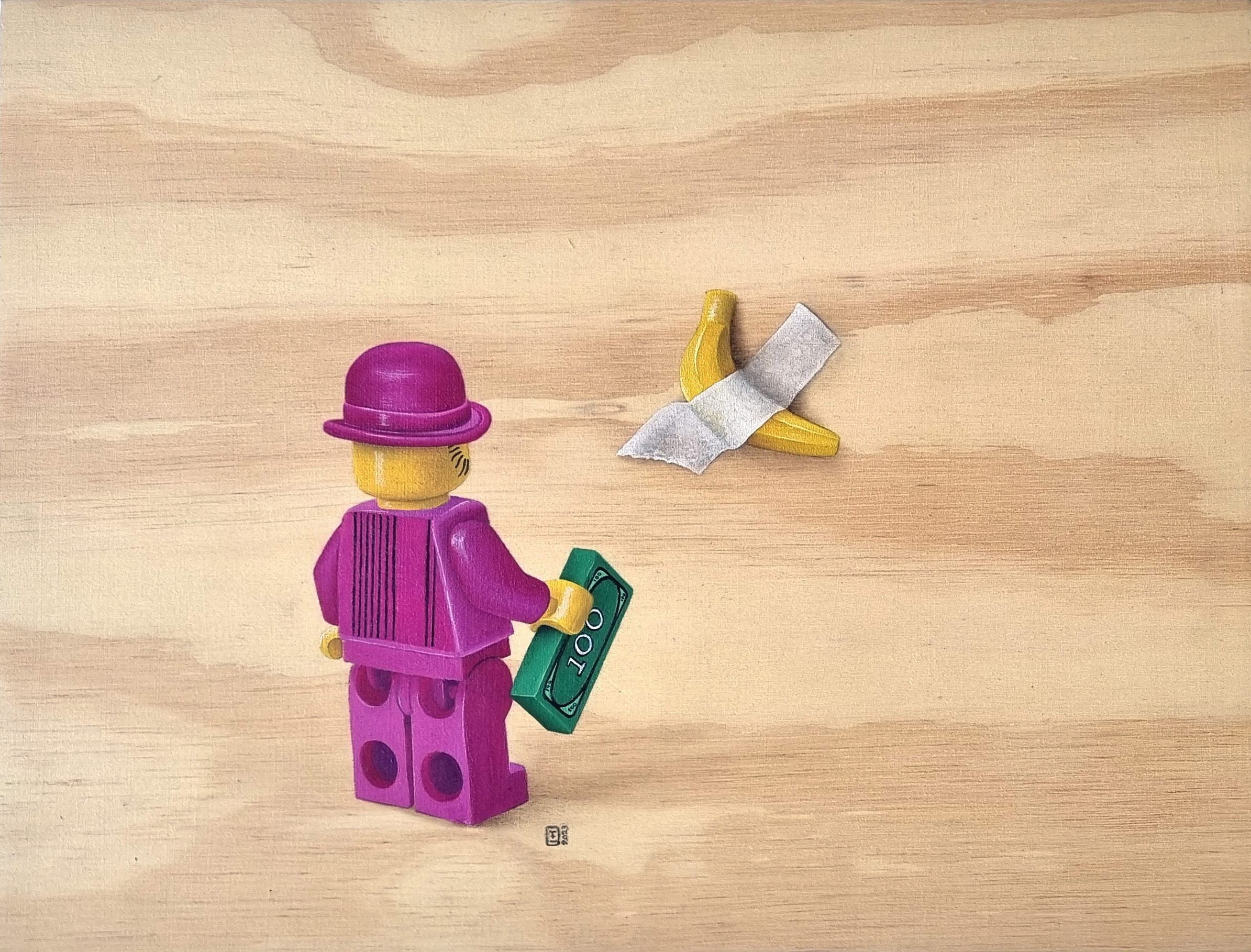LEGO art collector looking at a banana taped to a wall with money in his hand