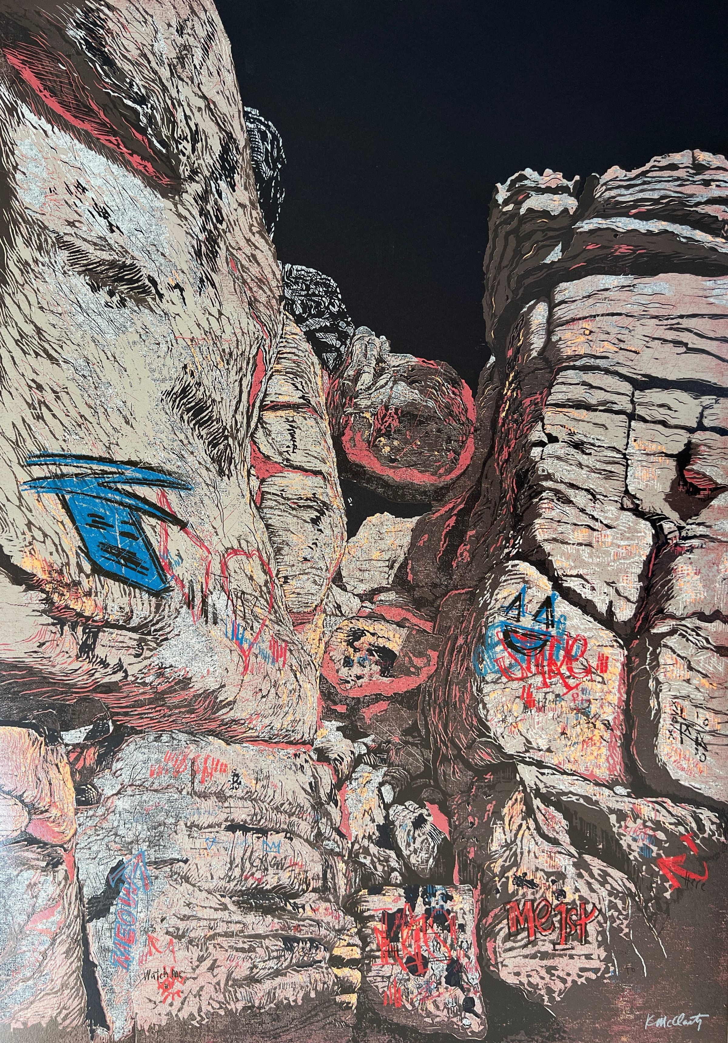 Reduction woodblock and screen print on Fabriano Elle Erre Black 160 gsm