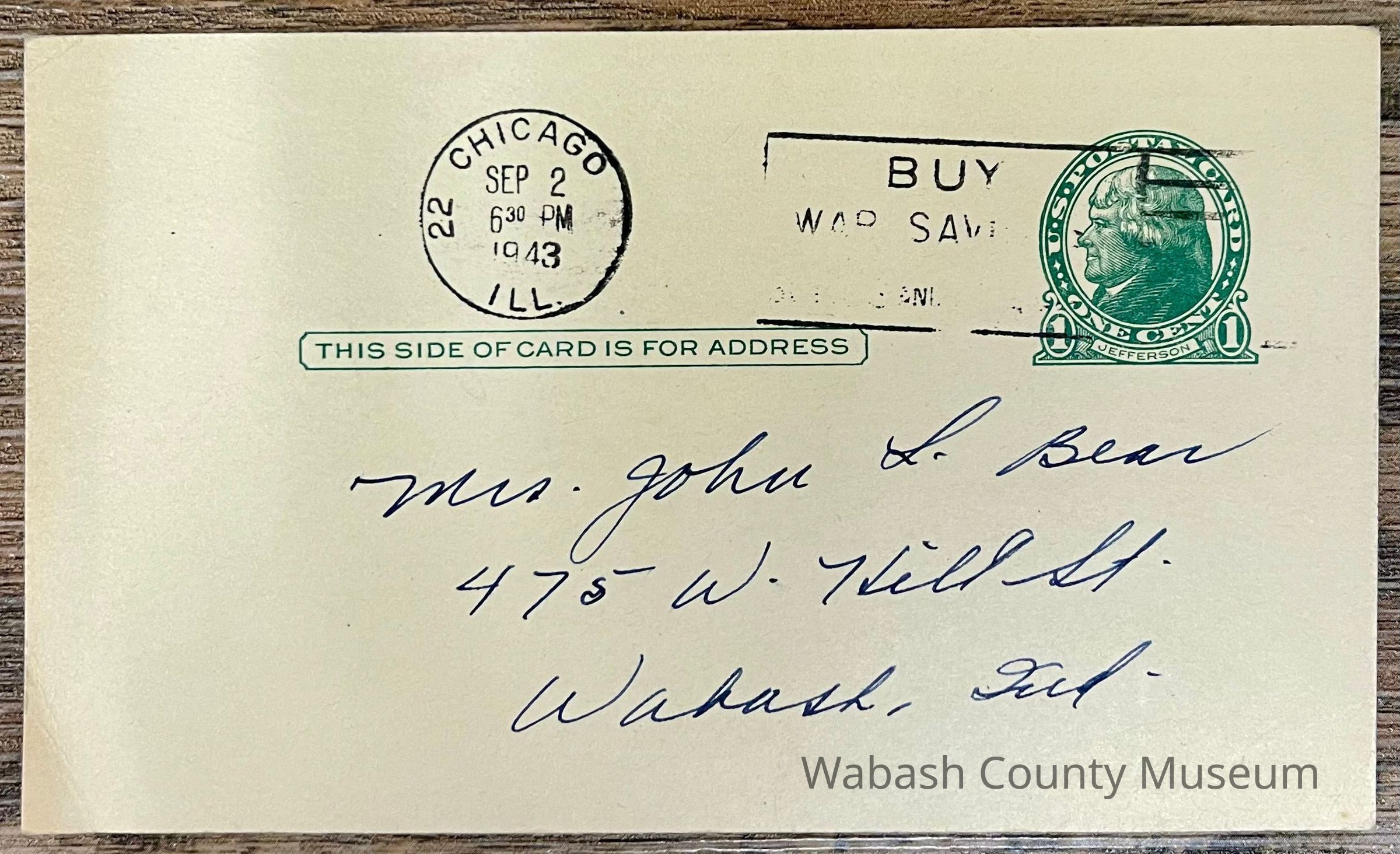 Postcard - Adressed to Mrs. John L. Bear from Marge (Sep. 2, 1943)Entry/Object ID