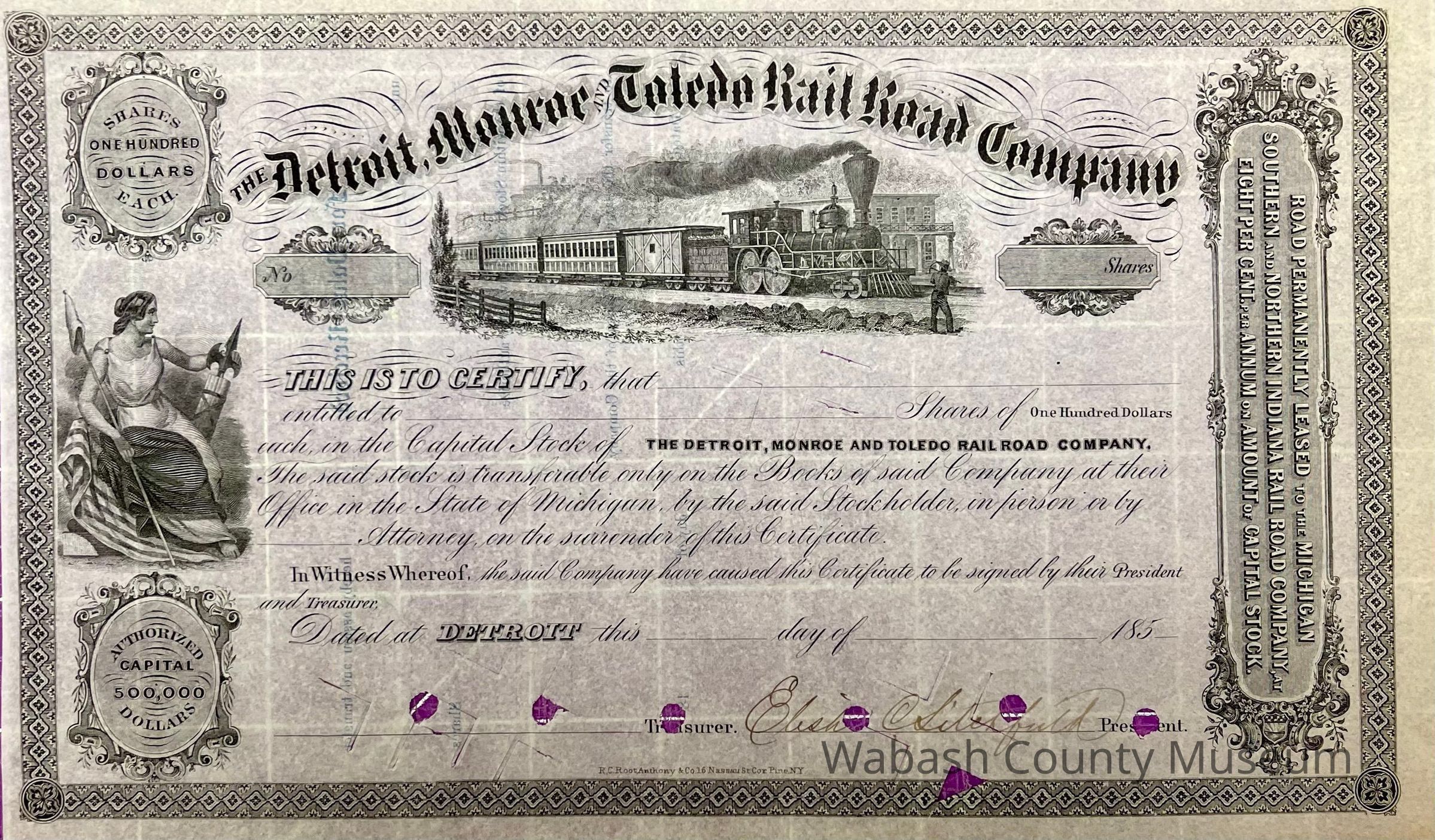 The Detroit Monroe and Toledo Rail Road Company - Stock Certificate printed in black on light thin paper. Under the name at the top is a vignette of a locomotive pulling a string of passenger cars. On the left is another vignette of lady liberty. Certificate is signed but unissued and is cancelled. Dated 185_.