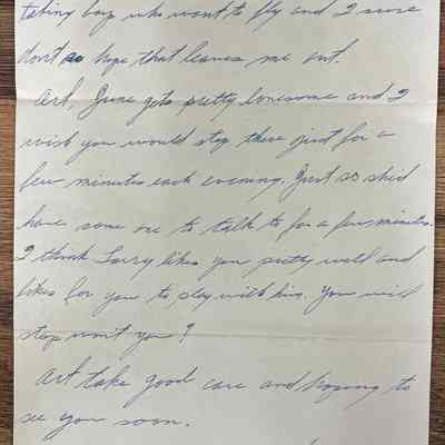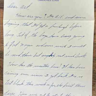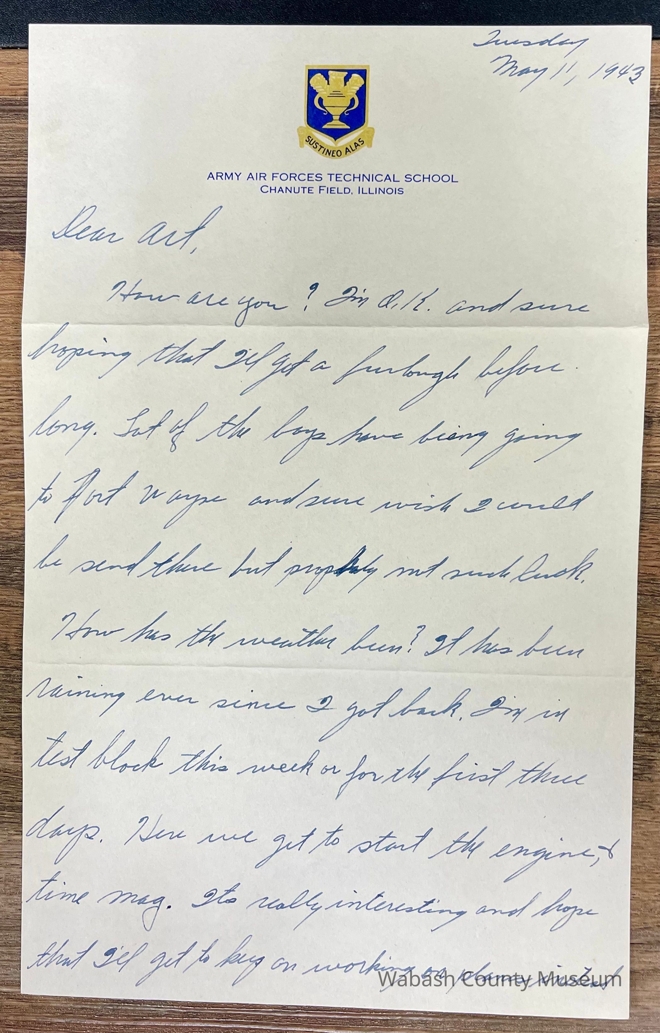 The letter is two pages, unlined stationary, with an embossed Army Air Forces Technical School Badge. Underneath it reads: Army Air Forces Technical School, Chanute Field, Illinois". Letter is written on one side of the page.