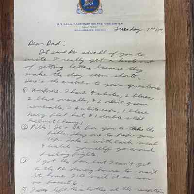 Letter is written on plain white paper. At the top is letterhead showing the emblem of the SeaBees (a flying bumblebee shooting a machine gun). Around the emblem in a circle is a rope and in behind everything are crossed anchors. Underneath it reads U.S. Naval Construction Training Center, Camp Peary, Williamsburg, Virginia