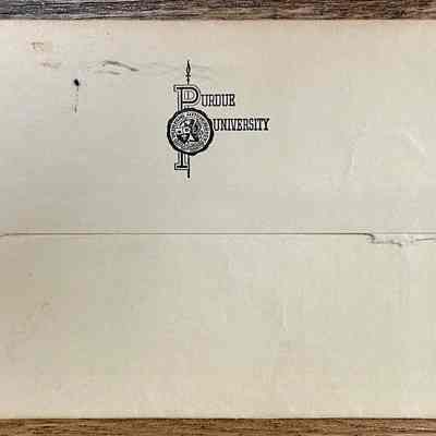On the back of the envelope it reads Purdue University with the Purdue seal over the top of the letters.