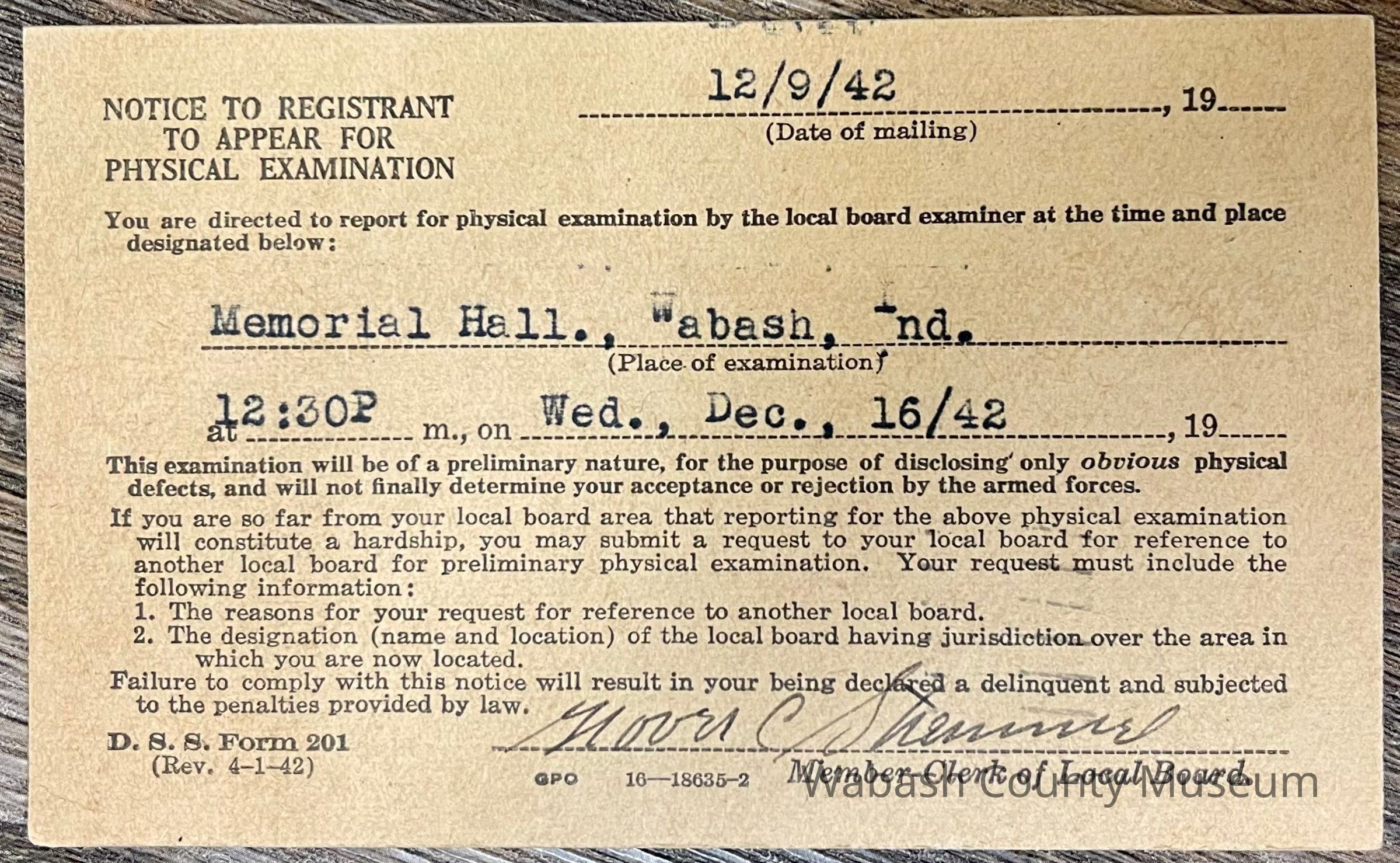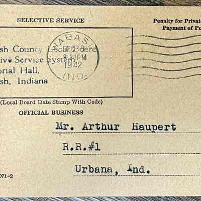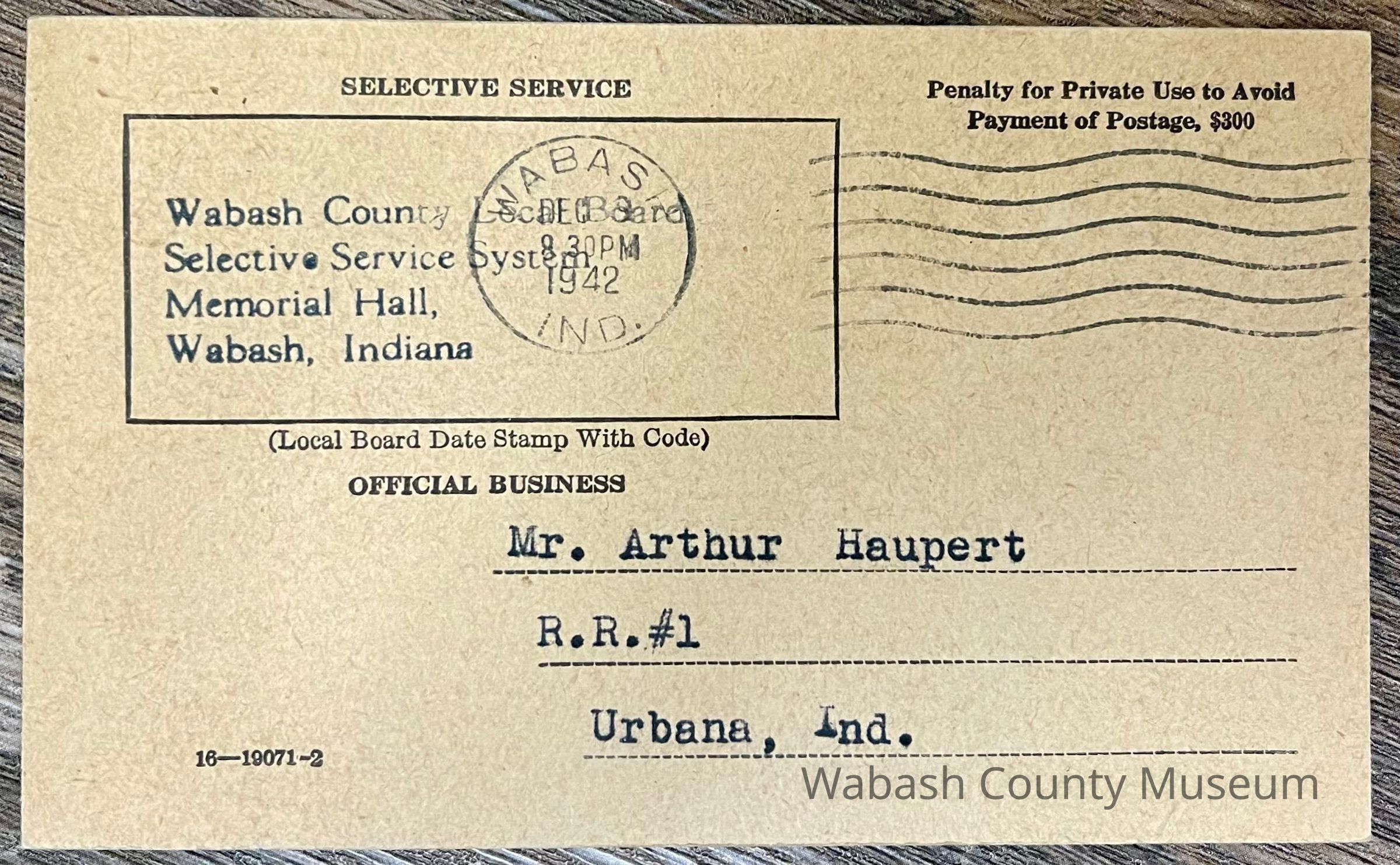 Selective Service (Draft) Notice to Registrant to Appear For Physical Examination sent to Mr. Arthur Haupert, RR#1, Urbana, Ind.
