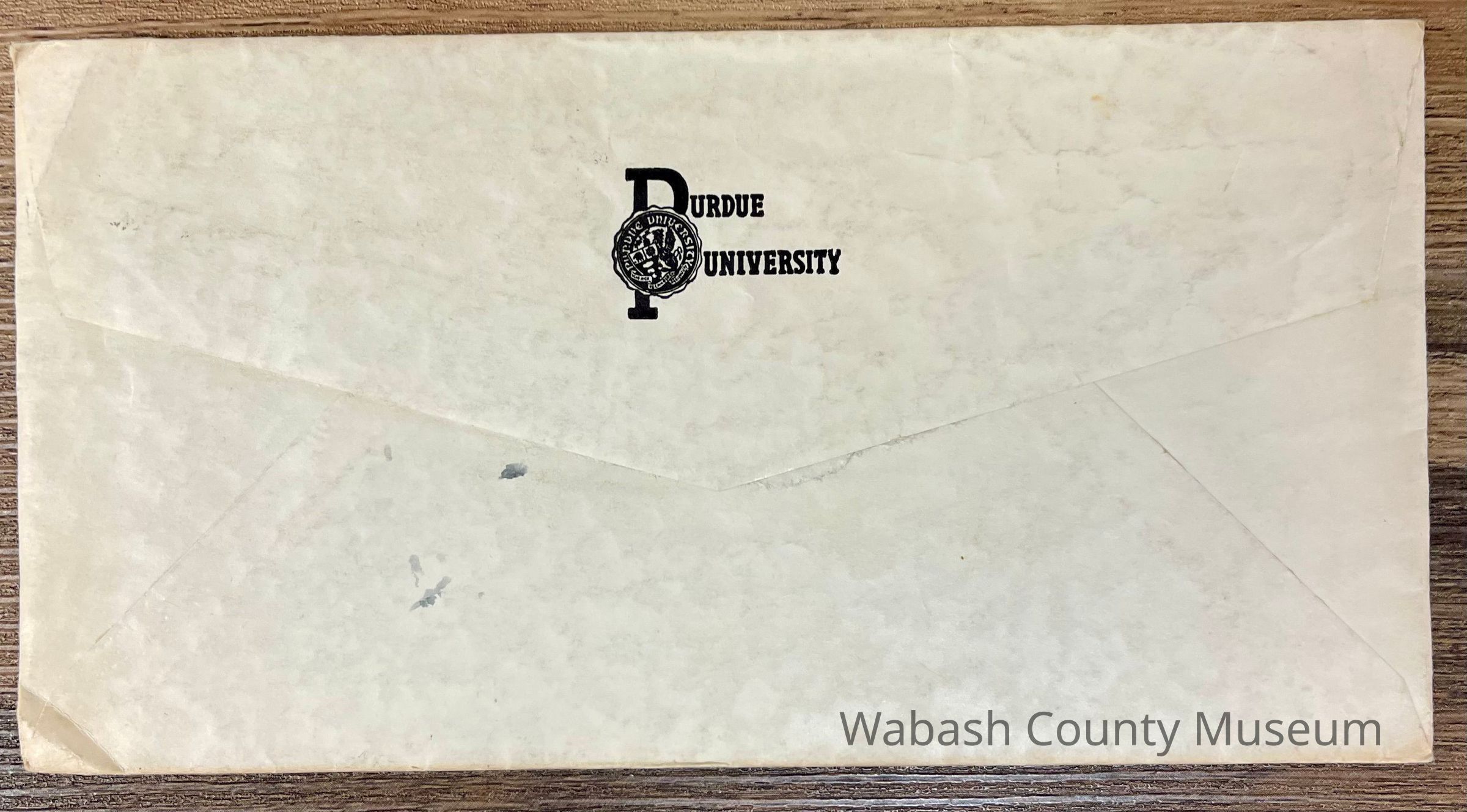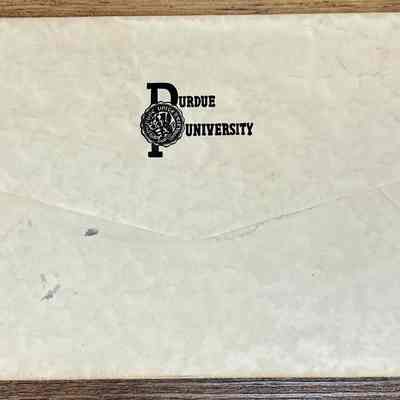 On the back of the envelope it reads Purdue University with the Purdue seal over the top of the letters.