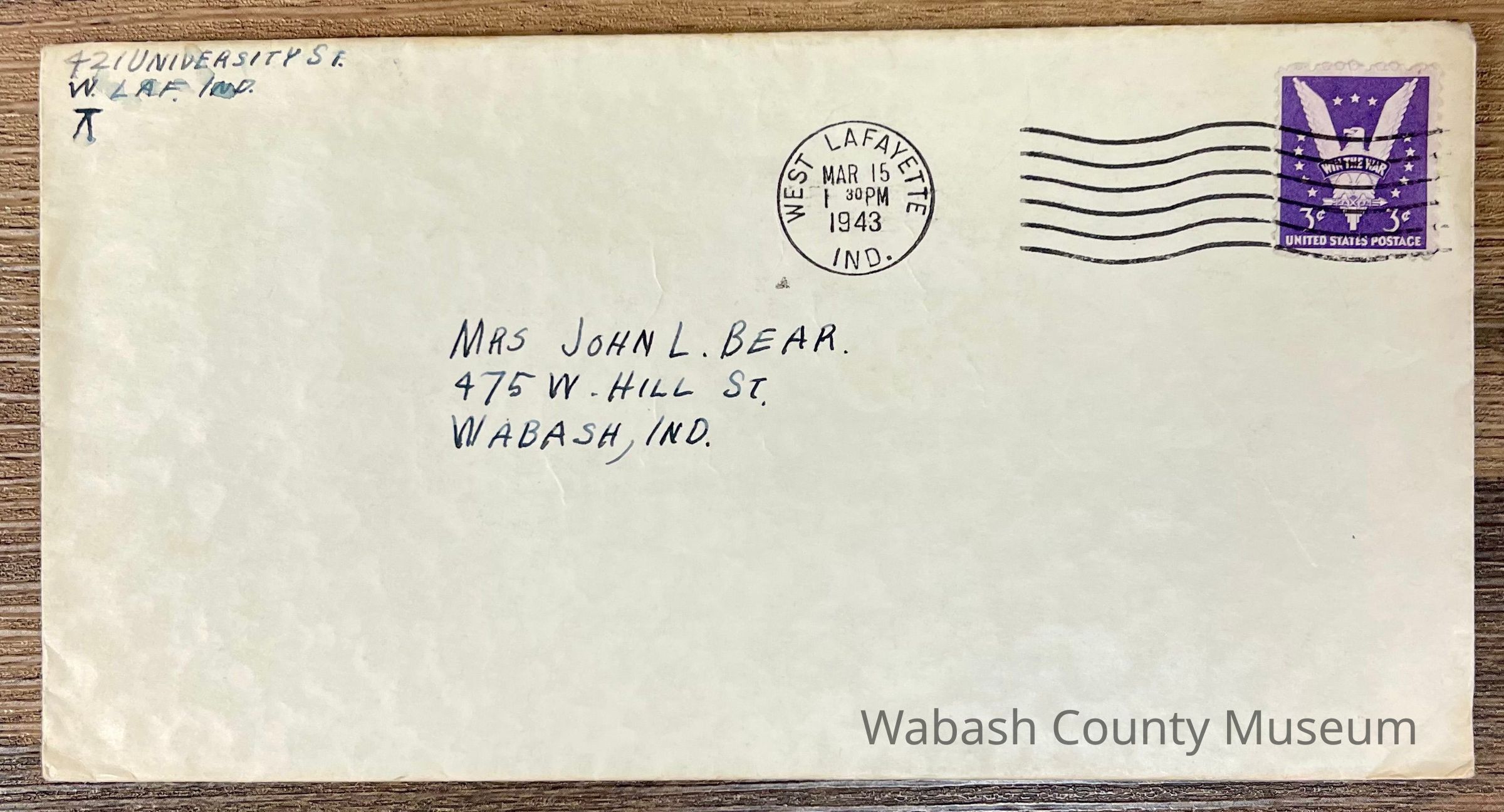 Postmark on envelope reads: West Lafayette, IND. Mar. 15, 1943 | 1:30PM