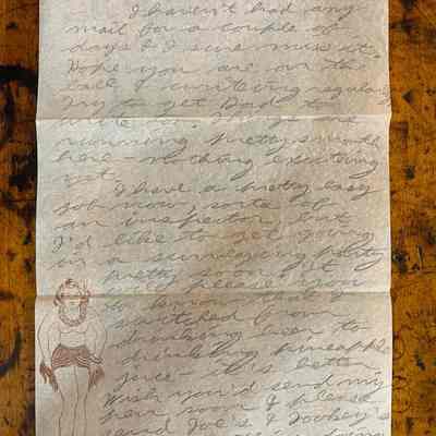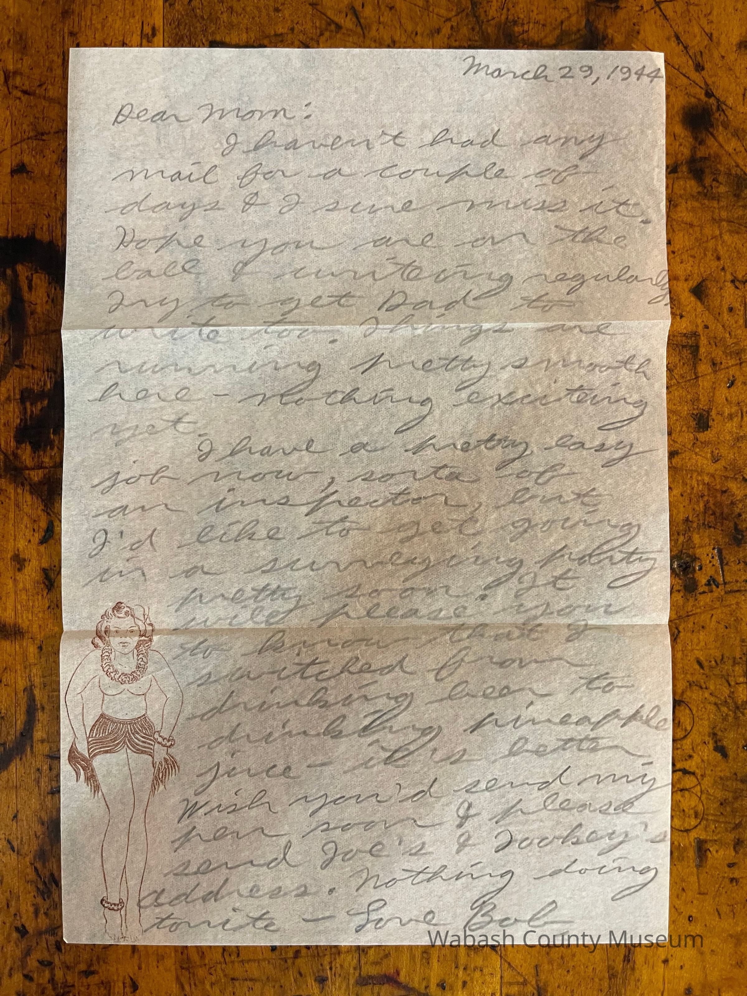 Letter is written on lightweight stationary and in the lower right of the page is a topless hula girl in a grass skirt.