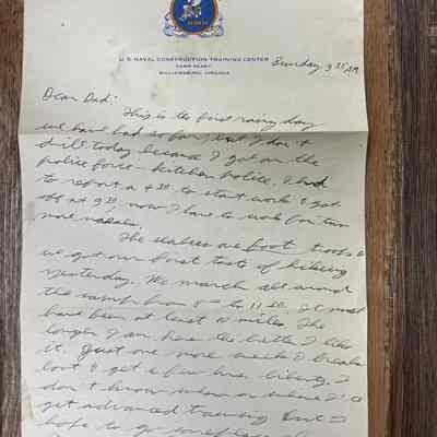 Letter is written on plain white paper. At the top is letterhead showing the emblem of the SeaBees (a flying bumblebee shooting a machine gun). Around the emblem in a circle is a rope and in behind everything are crossed anchors. Underneath it reads U.S. Naval Construction Training Center, Camp Peary, Williamsburg, Virginia