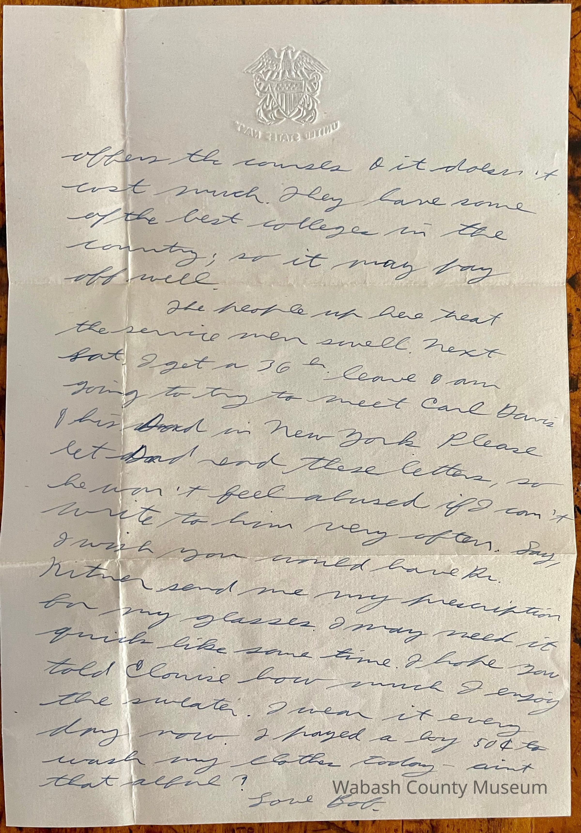 Letter is written on plain white paper with a golden eagle an shield with crossed anchors. Underneath it reads United States Navy. It is hand written, unlined and one page in length and written on both sides.