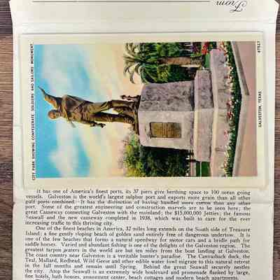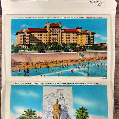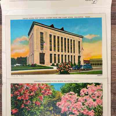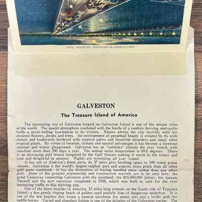 This is a set of ten postcards with different photographs front and back highlighting places in Galveston Texas. In addition to the postcards, on their cover, in the inside, is a description of Galveston "The Treasure Island of America"