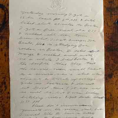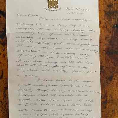 Letter is written on plain white paper with a golden eagle an shield with crossed anchors. Underneath it reads United States Navy. It is hand written, unlined and one page in length and written on both sides.