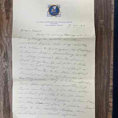 Letter is written on plain white paper. At the top is letterhead showing the emblem of the SeaBees (a flying bumblebee shooting a machine gun). Around the emblem in a circle is a rope and in behind everything are crossed anchors. Underneath it reads U.S. Naval Construction Training Center, Camp Peary, Williamsburg, Virginia